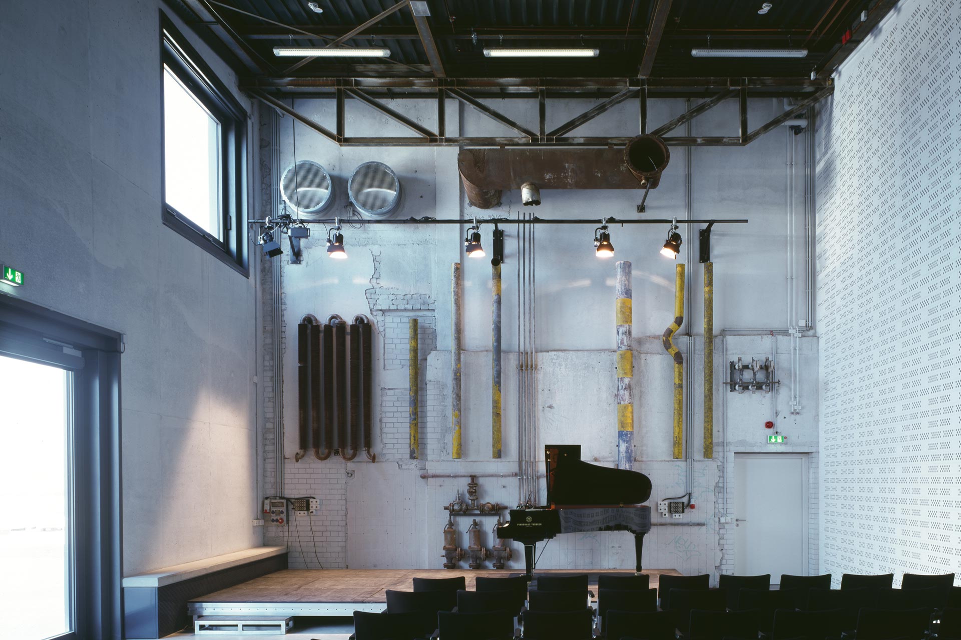 One important goal was to achieve upscale user comfort in the rooms, if possible without high energy usage for ventilation, heating and cooling. The climate of Norderstedt offers excellent conditions for natural ventilation. An existing subbasement, converted into an earth canal register, now conditions the supply air, which enters the two event rooms through source air outlets in the stands, benches and via the stage area. A 20 m high exhaust chimney generates the drive for this purpose. Natural ventilation is only mechanically supported in calm conditions or high outside temperatures. A radiative ceiling heating system heats the rooms in the winter and cools them in the summer, using groundwater from a well.