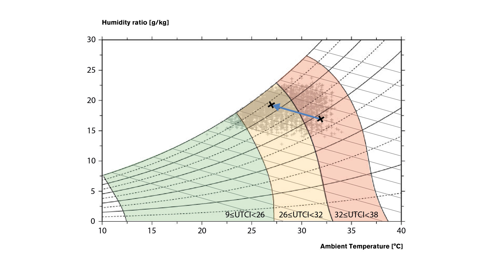In warm and humid climates, misting systems are often installed to improve conditions in public spaces. However, people often reject them as they are sprinkled with water droplets and disturbed by noise. When the Transsolar engineers studied the process with advanced human-biometeorological models they found that fully developed adiabatic cooling and elevated air speeds could, in theory, create a great improvement of outdoor comfort. Initial experiments by Transsolar showed that such a process could be realized with very small droplets created by specially designed high pressure nozzles and the focused air flow of a fan. As the droplets fully evaporate and people feel only a cold breeze, we called the technique Dry Mist.