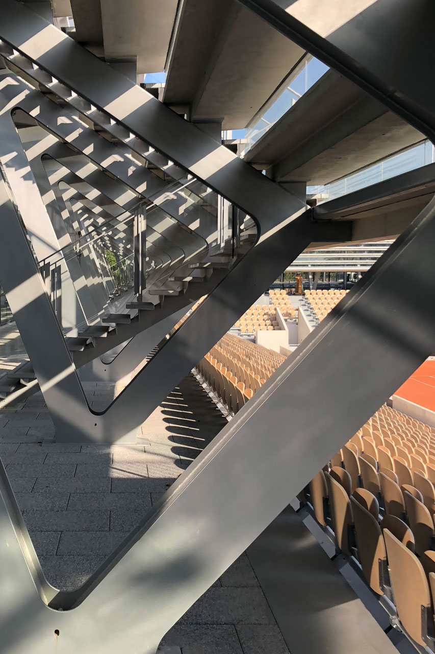 The "Court des Serres" is a tennis court with 5000 spectator places enclosed on four sides by botanical greenhouses. These greenhouses, accessible to visitors, will house and display the botanical collections of the city of Paris.