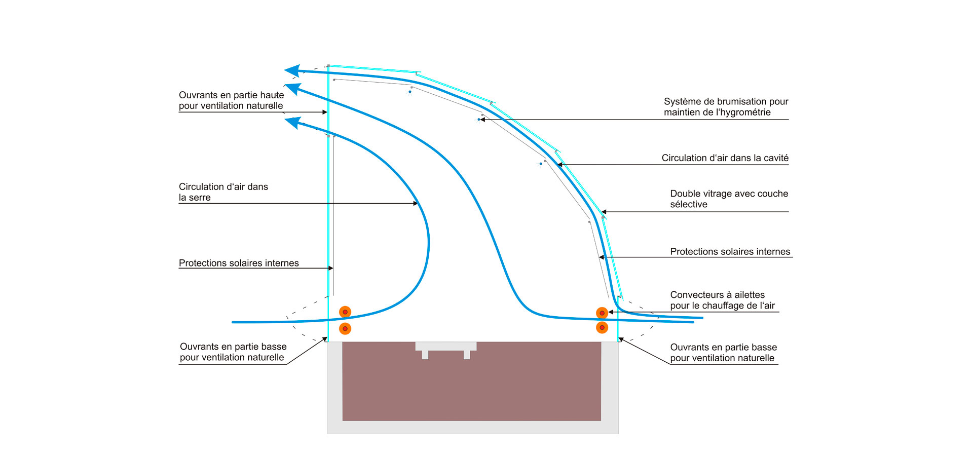 The air flow and renewal will be completely natural. The height difference between the openings distributed in the upper and lower parts of the facade create a stack effect that will ensure a sufficient hygienic air change rate for the plants as well as the visitors.