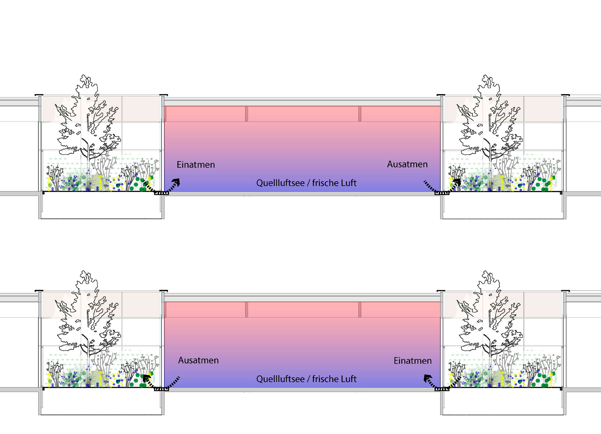 Via an integrated design process, Transsolar developed the energy and environmental concept, which includes strategies for thermal comfort, air quality, solar gains, shading and daylight. Dynamic simulations were used to optimize ventilation and daylight. The 13 vegetated atriums represent innovation for both architecture and air quality: Sized between 20 and 30 m², they maximize daylight penetration to the building interior and they are key for natural ventilation.
