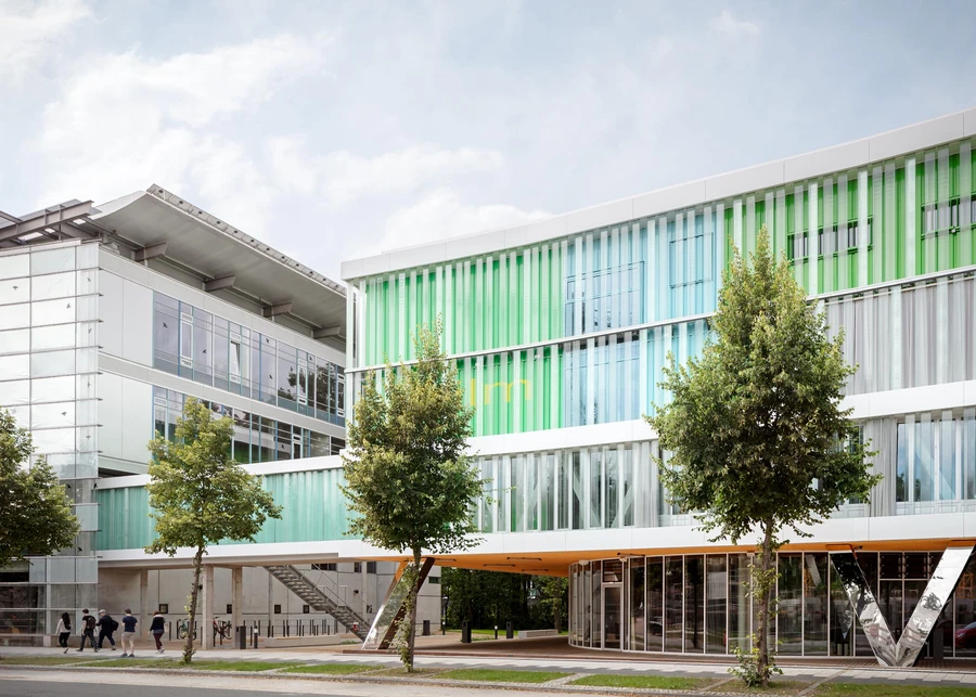 Founded in 1954, the former German Academy of Cinematography in Potsdam-Babelsberg was renamed the “Filmuniversität Babelsberg KONRAD WOLF” in 2014. The main building from 2000 consists of five individual buildings connected by glass atriums to form one building.