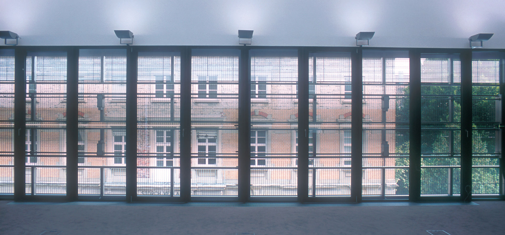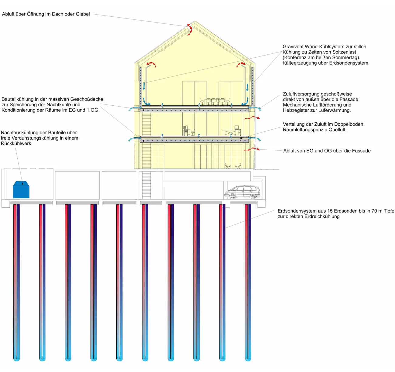 Cooling is achieved by active slabs integrated in the ceiling of each floor. In the training and conference areas additional wall embedded fluid systems behind facing frameworks have been installed that act as a gravity driven cooling system.