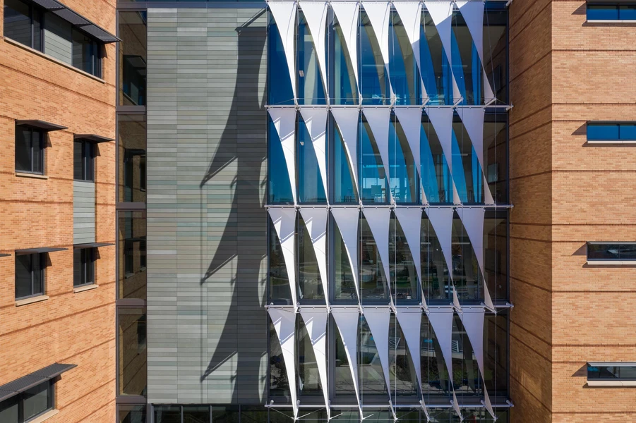 During the schematic design phase, Transsolar focused on the particularly important early design decisions, such as massing, orientation, air cascade between different space types, and the like. One area of high impact for Transsolar was proposing the unique twisted fabric shading on the atrium façade. In the design development phase, the focus shifted to the details of the façade design, shading, material selection, and integration of mechanical systems into the architectural design.