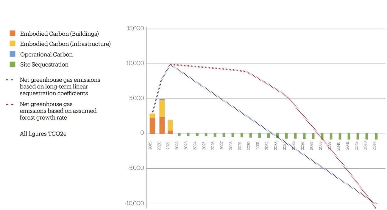 The institute has the quality of a model for sustainable building, as the campus is expected to meet the predicate "climate-positive" before 2040, when it will store more CO2 than the buildings' operations and ecological footprint make up. This is made possible by using local materials such as rammed earth and dried adobe for construction, and on-site reforestation. The solar array island system provides 3,775 megawatt-hours of renewable energy annually and will meet all of the building's electricity needs.