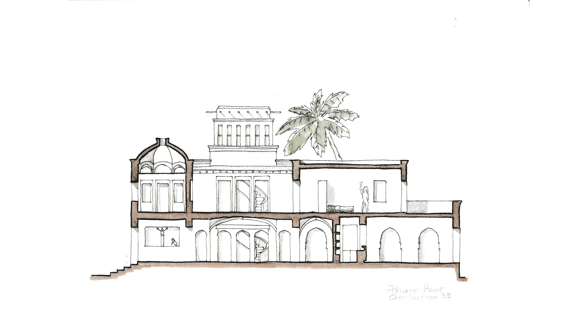Efforts were made to avoid a desalination plant, which is standard practice among the neighbours, but instead explore less energy intensive options like rainwater harvesting and ground water. Rainwater harvesting theoretically could provide sufficient water for the entire year but was considered not viable as the only option due to the size of the underground storage needed.. The ground water extraction was also not a viable option due to contamination. Nevertheless, a concept was developed to reduce the desalination requirements by combining with rainwater harvesting. The outdoor pools were designed to be shallow to reduce the volume of water. Natural ways of filtering the pool water was considered to avoid chlorinated water. These concepts were explored with IB kraft. An above ground water tank was sized to cover water demand of at least day and to ensure sufficient pressure in the pipes. Transsolar was given the tasks of enabling the lowest possible energy demand, quantifying it and reconciling it with the possible input from photovoltaics. The first step was to optimize the passive design of the buildings. Solar radiation and climate analysis were used to add sun protection and the various options of how these shading devices can look to be cohesive to the design was together explored with the architect. Different spaces were zoned and categorized for different comfort conditions.