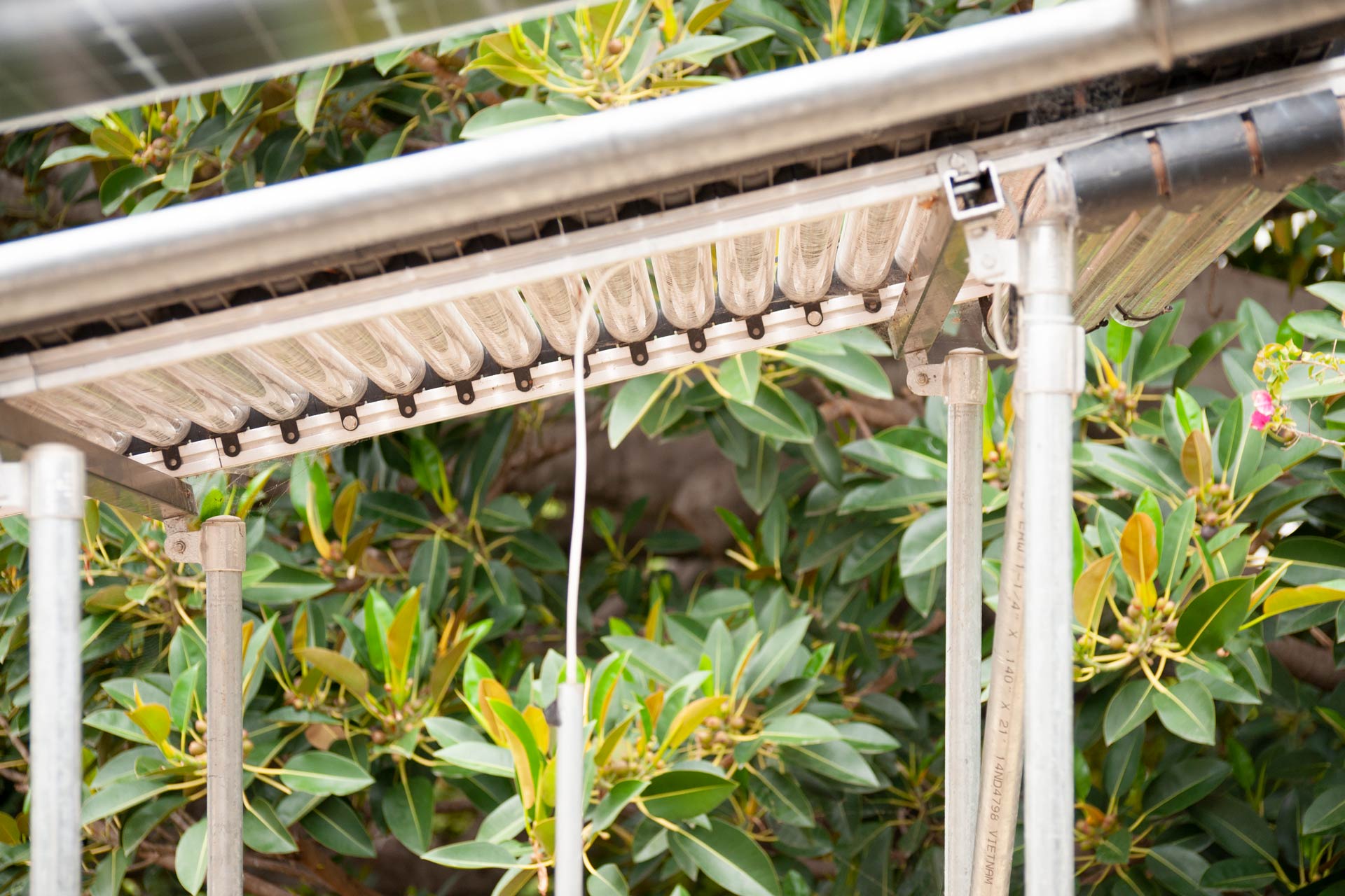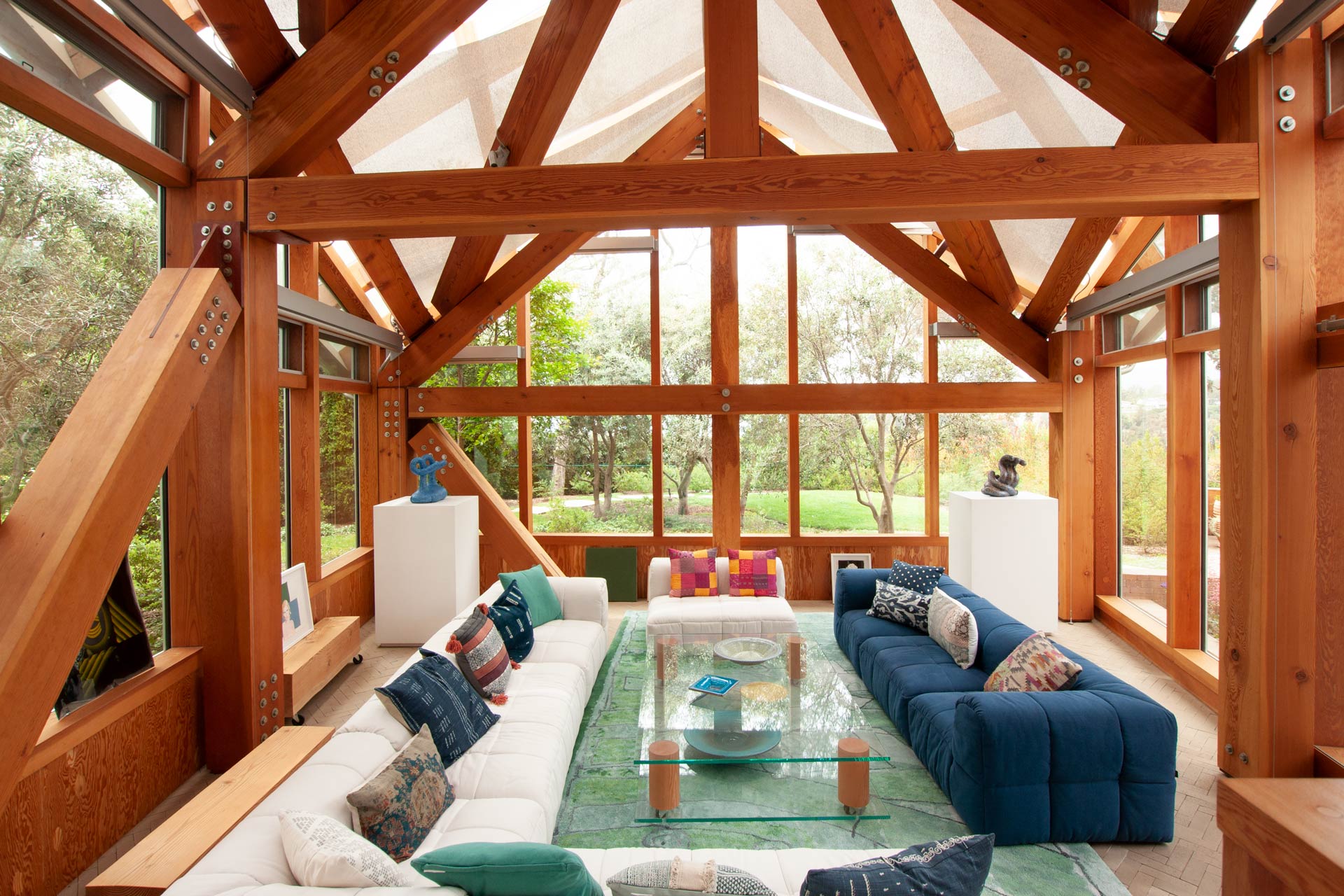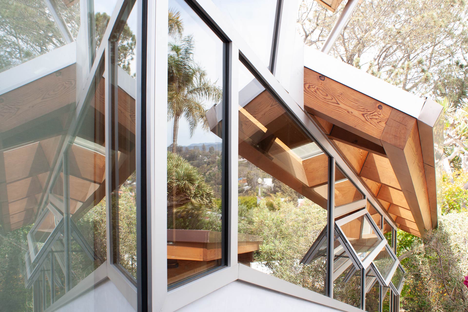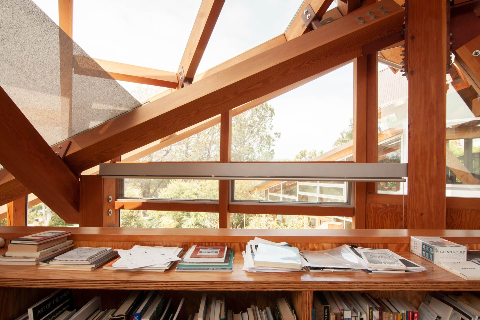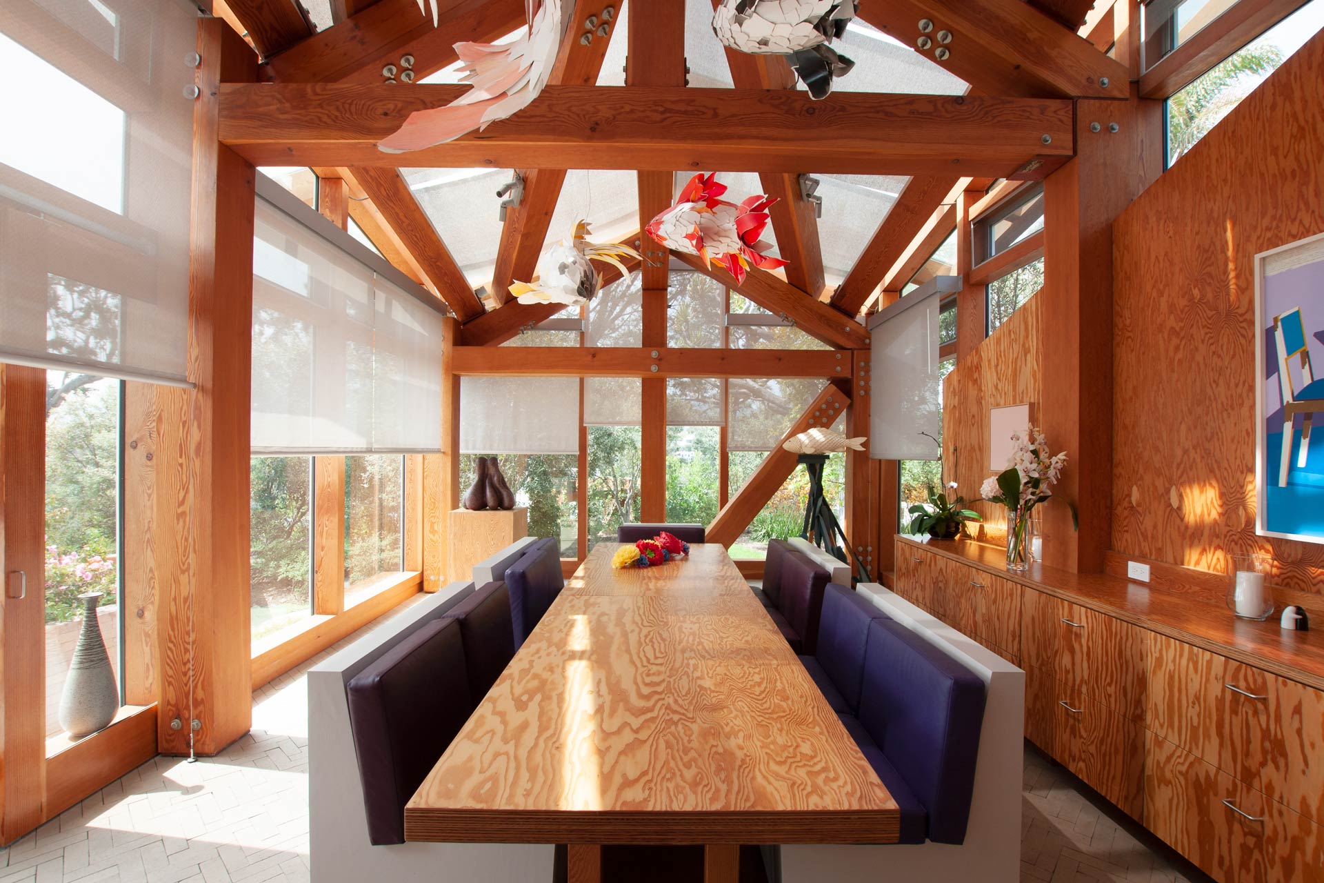 Solar gains are limited by roof overhangs, a selective double glazing and a motorized freely ventilated interior shading with a room-side low-e coating. The view of the Pacific Ocean should remain as unobstructed as possible, which was achieved by a residual transparency of the solar shading even when closed. In addition, works of art in the house had to be protected from direct sunlight. The cross-ventilation driven by the wind and supported by the open construction via the chimney effect dissipates external and internal heat loads via the gable openings.