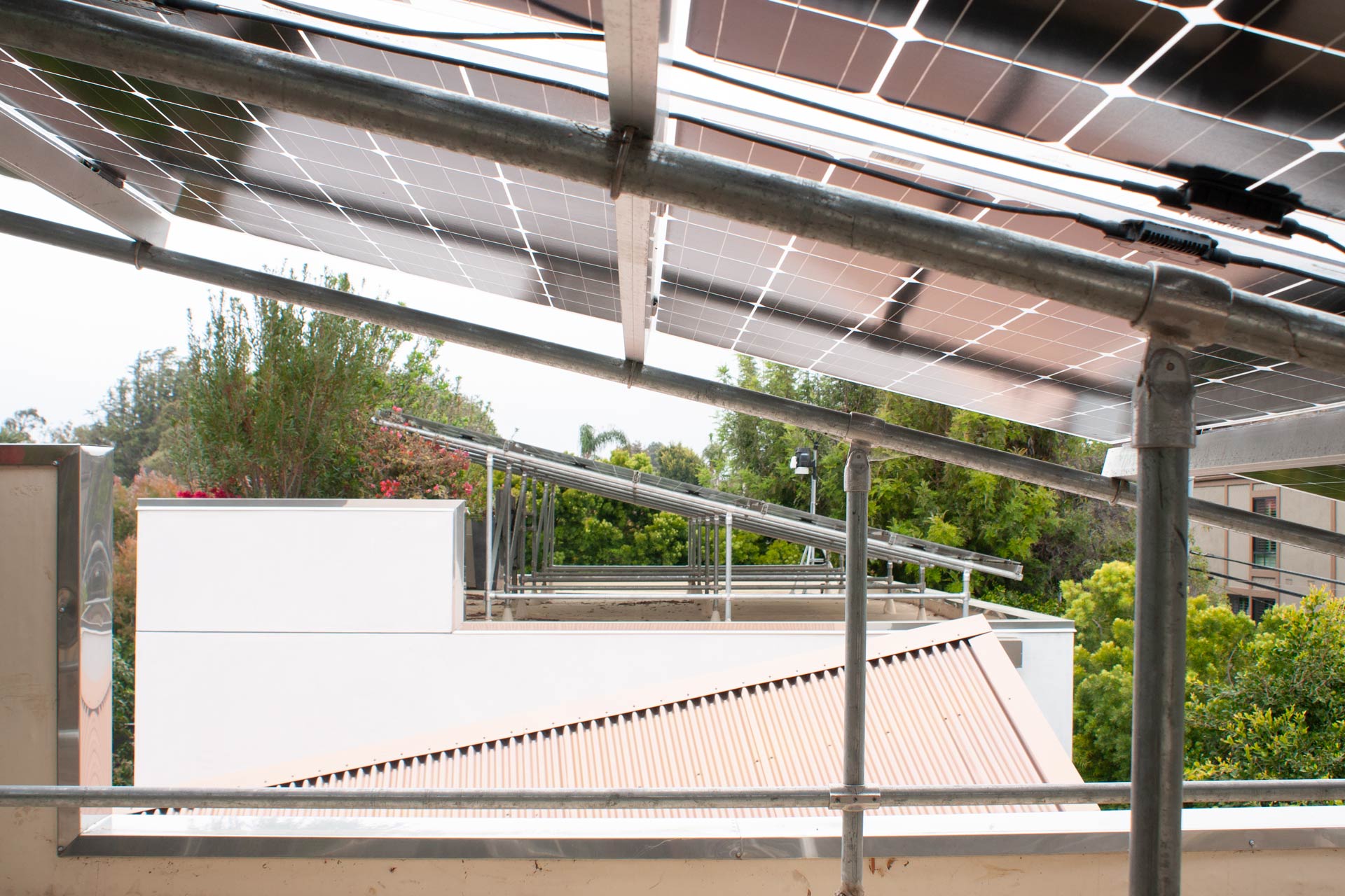 The climate concept, which was explicitly designed to operate without traditional air-conditioning, is based on wind-driven cross ventilation to ensure low emissions. Since the building is targeting to become the first zero-energy house in Santa Monica, the Santa Monica authorities allowed the building to be built three meters higher than the specified construction line based on the airflow analysis, so that it could use the best wind exposure for the natural ventilation. A big advantage of this location aside from the Californian sun is the constant wind from the Pacific Ocean to the West, cool in summer and rather warm in winter, but generally dry.