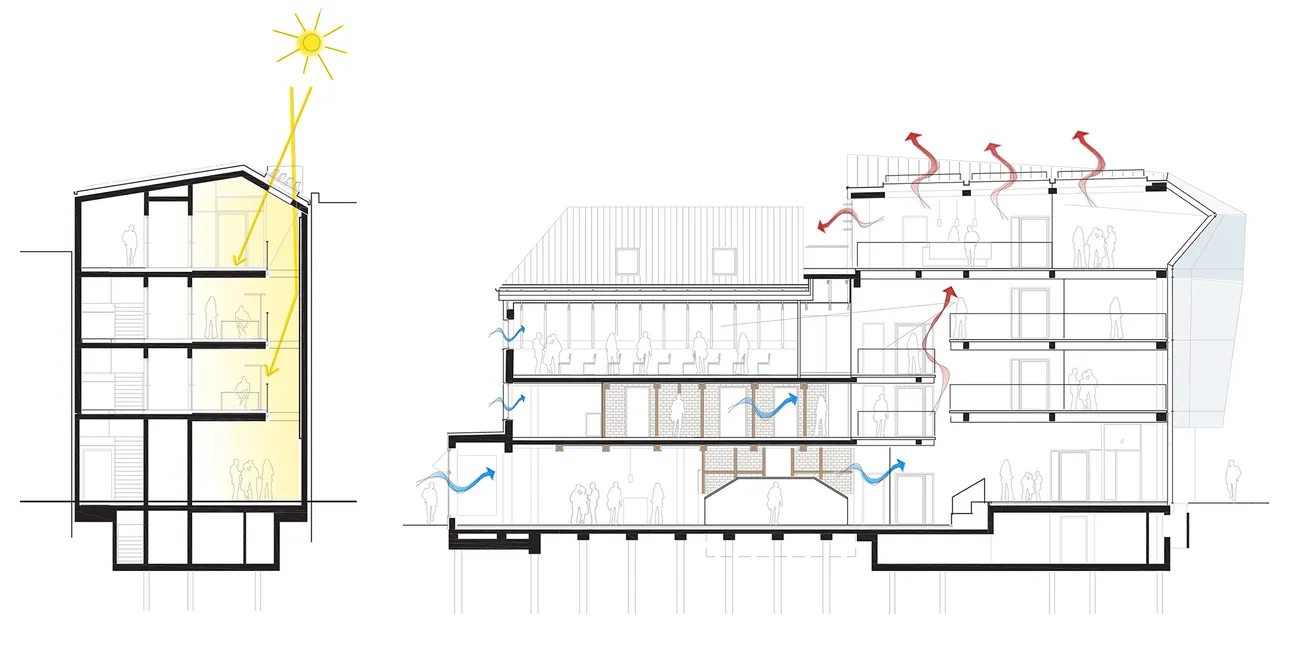 The desire to create a passive net zero building within a dense urban fabric guided the design of the Schlaues Haus. The extension connects to the old renovated building, creating a footprint of 12 x 33 m (39 x 108 ft) and forming one air volume.