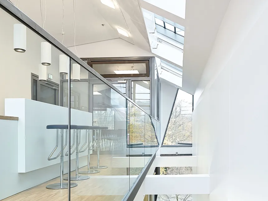 The urban situation of this small, 12 meter wide property enclosed by buildings on either side required a sophisticated daylight strategy. A vertical corridor between the new South façade and the old building maximizes daylight. It provides sufficient daylighting in the depth of the building complex and at the same time acts as a solar chimney to exhaust air. This allows for natural cross ventilation on all floors of the new and old building. The south facing façade is equipped with fixed micro-louvers integrated into the glazing, providing sufficient shading, while the angled south-west facing section requires retractable blinds; heat losses and solar gains were balanced through thermal modeling.