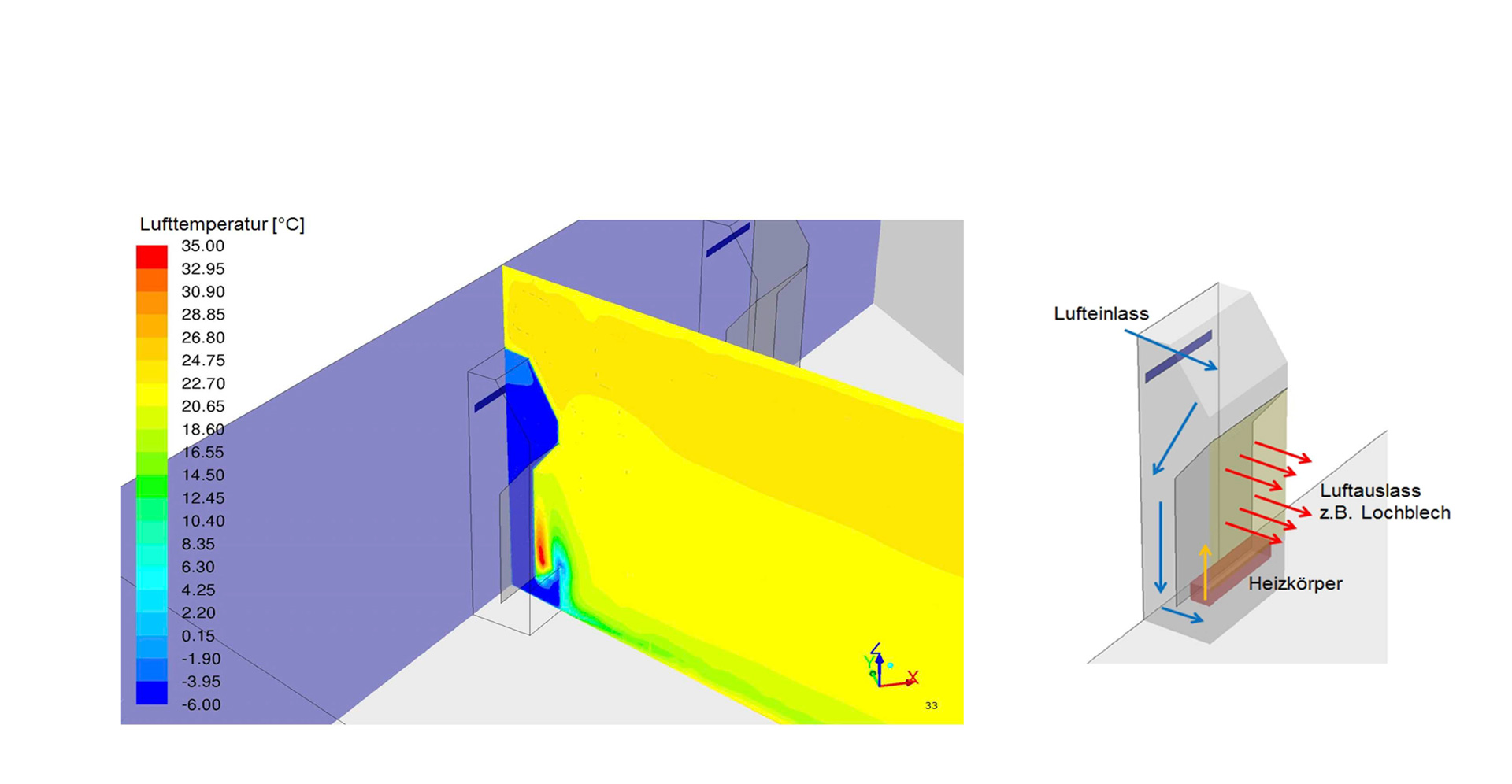 Fresh air is provided by specially developed elements integrated into the exterior façade. They allow comfortable air supply in a natural way even in winter. Each element consists of a box through which fresh air flows through ventilation flaps, an air deflector and a radiator prior to being distributed into the cafeteria. Thus drafts and cold air entry are effectively reduced.