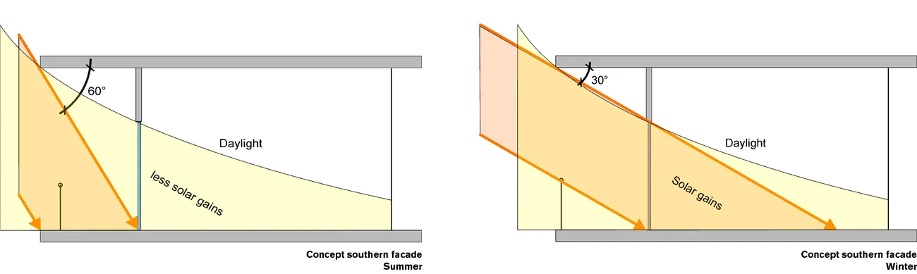 Transsolar supported the design team during the competition phase in developing a very high FAR masterplan, but nevertheless providing highly comfortable indoor and outdoor spaces combined with a reduction in energy demand. With daylight and solar tools Transsolar supported the distribution and shaping of the buildings to achieve the optimal forms and orientations to maximize solar access for all apartments leading to physical comfort and reducing heating demand in winter and shoulder seasons. To minimize solar heat gains in summer external movable shades filled with horizontal louvers have been installed depending on the façade’s orientation, providing an individual element of privacy as well. Local wind conditions foster cross ventilation, ensure high indoor air quality and provide a cooling breeze through the apartments in the intermediate and summer period. By combining night time ventilation and the use of the exposed thermal mass of the concrete ceilings, cooler night time temperatures can be stored and made available the next day. Furthermore, the shape of the blocks creates a micro climate zone within their courtyard which is protected from the wind and with direct solar access, providing a comfortable outdoor space for the community.