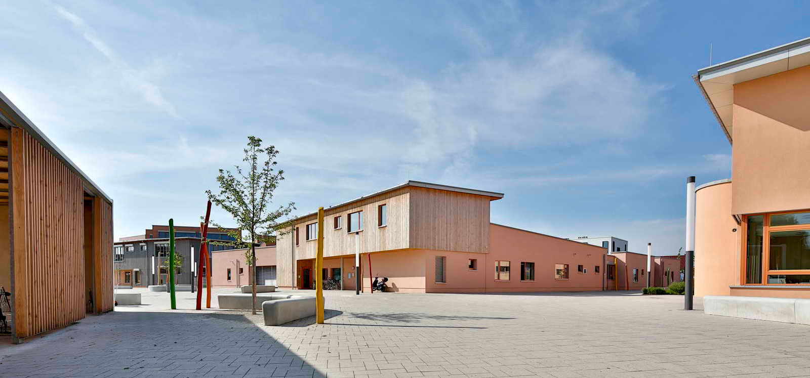 The City of Walldorf’s new “Soziale Mitte” is the link between the existing city center and the newly built neighborhood Walldorf South. It consists of four buildings which house the extension for the primary school, a kindergarten, an after-school care and a gym with canteen for all generations.