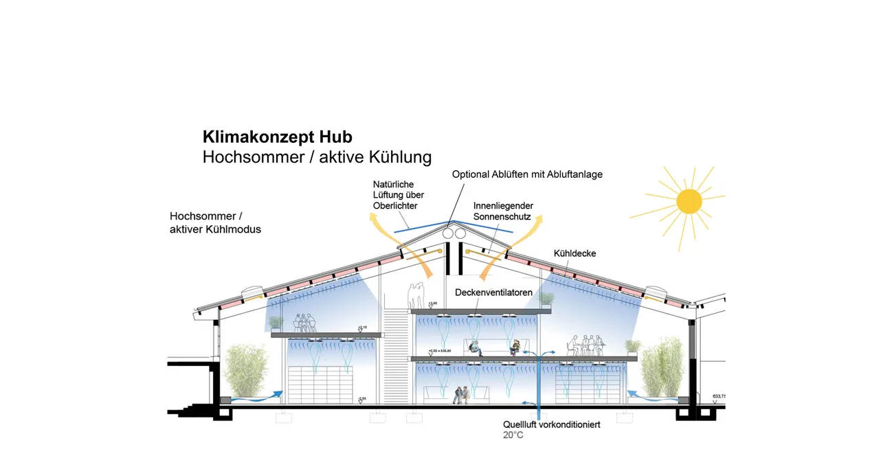 The concept requires additional skylights to achieve better lighting of the usable area and to enable natural ventilation during the day and at night. Nighttime cooling is essential to dissipate the heat of the day from the building in summer, as active cooling is consciously avoided.