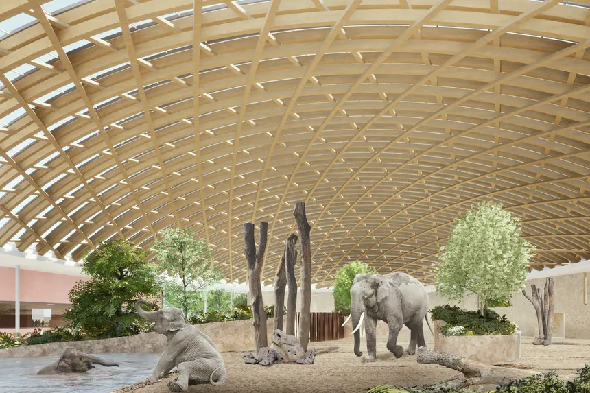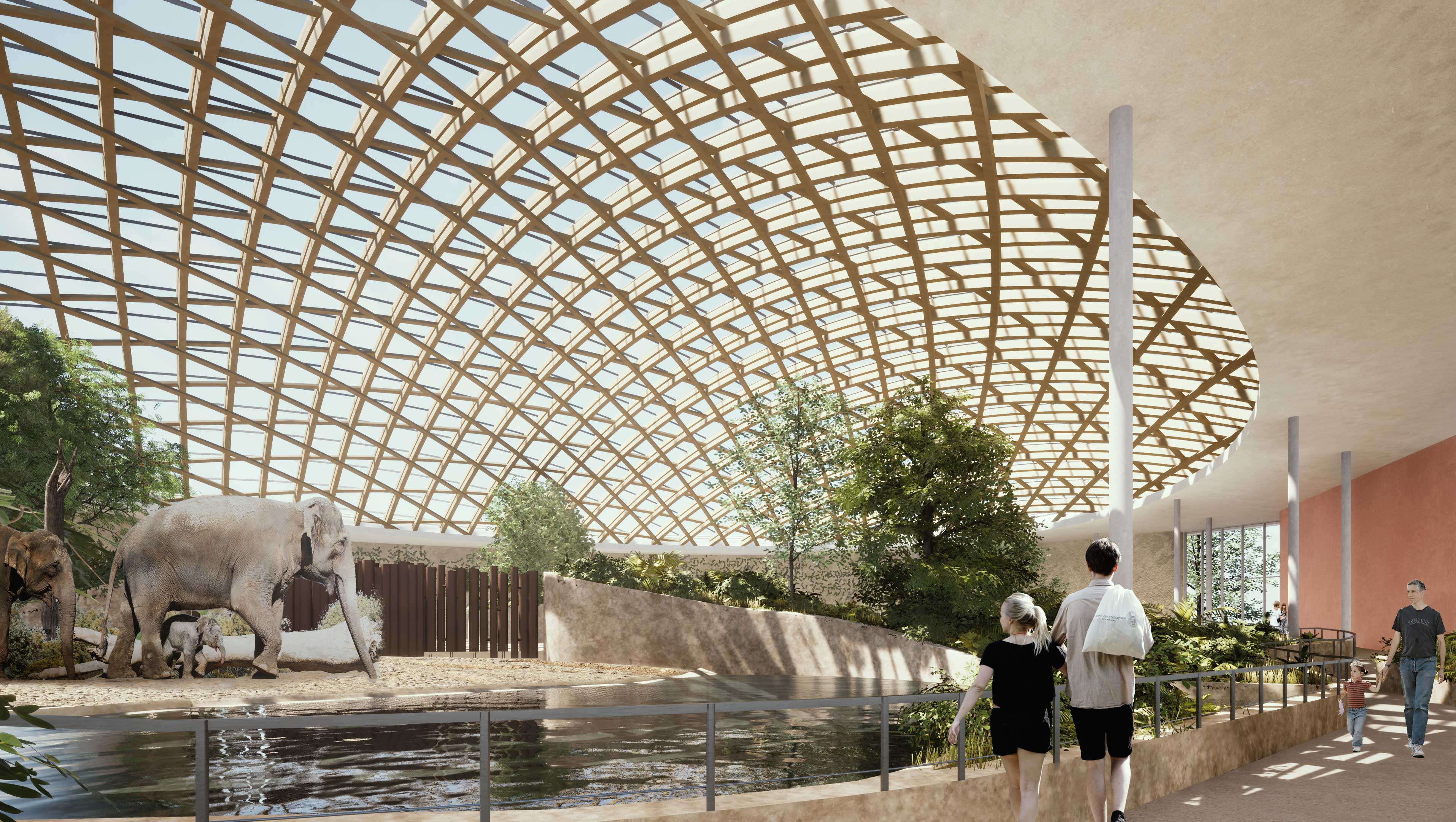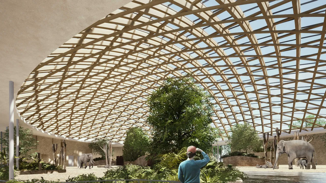 The botanical garden and Zoo "Wilhelma" in Stuttgart is realigning and modernizing itself at the same time. The crowning project for the emerging Asian complex is „Elefantenwelt“, (Elephant World), a new building with a large outdoor area. The existing building is already more than 40 years old and will be replaced by a modern building that allows for contemporary keeping: a wooden shell construction with a span of 100m / 330 feet, with large outdoor facilities offering enough space for a herd of Indian elephants.