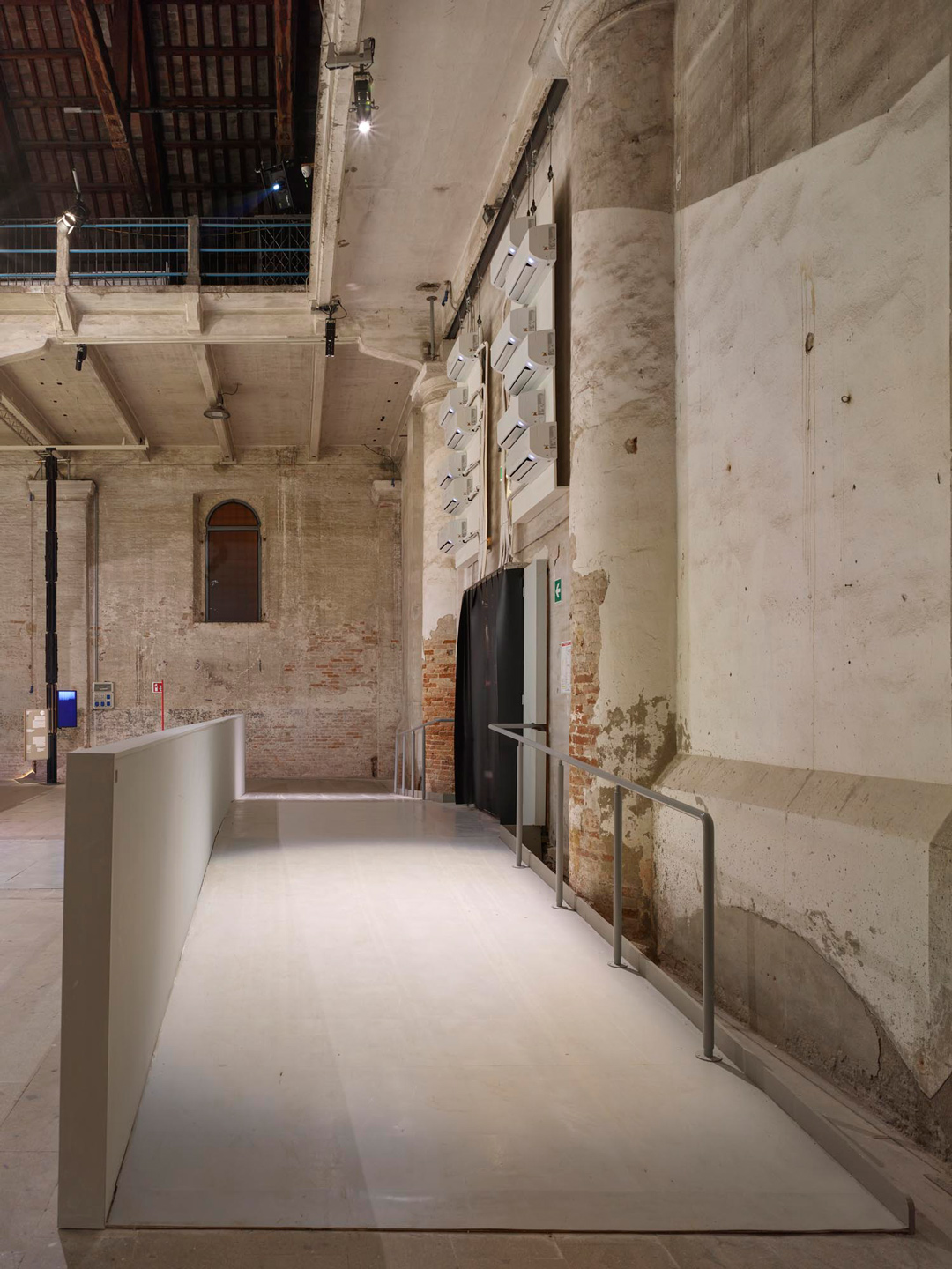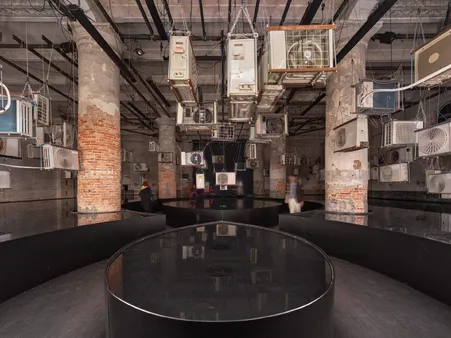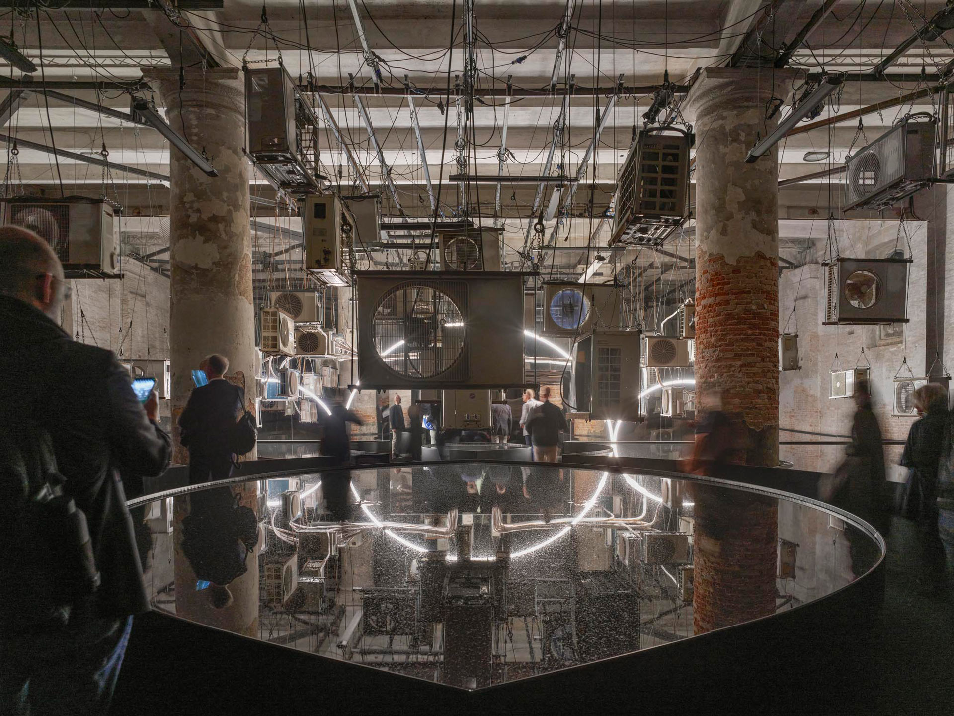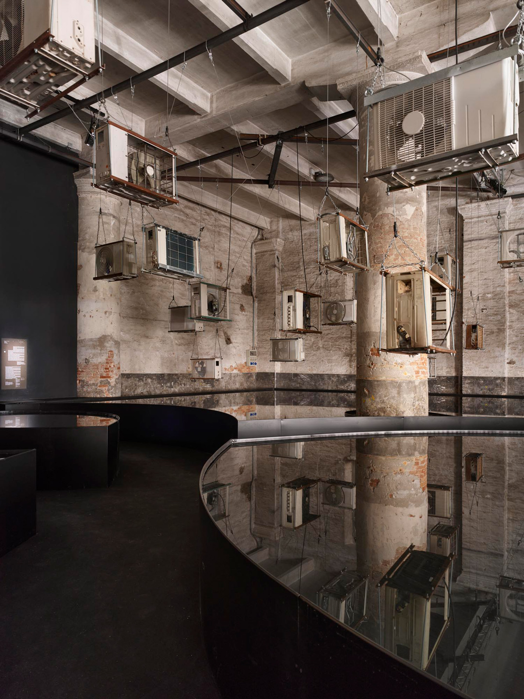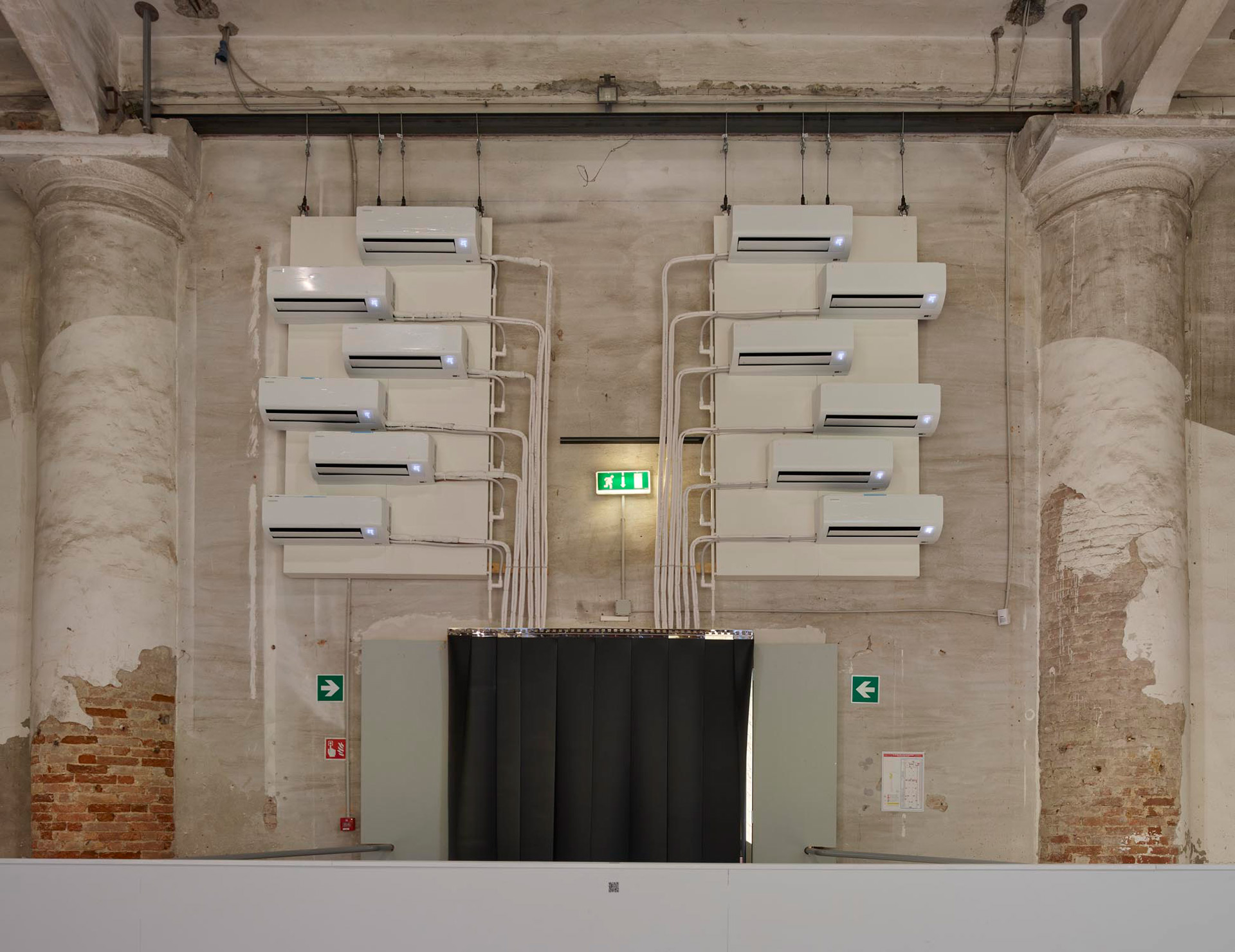 The installation addresses these topics both literally and allegorically. 80 of the 92 air conditioning units were sourced from Italian scrapyards, and 12 of these are fully functional, pumping waste heat into the entrance hall while cooling the main exhibition hall. As visitors move through the space, they also journey through time: At the entrance, the conditions of the outside world still prevail on a summer's day in Venice 2025, but as you cross the room, the density of the air conditioning units increases, and the heat rises. However, a horizontal temperature gradient is naturally unstable – gravity acts on the air, causing movement. Therefore, the increasing heat along the path is deliberately supported radiantly. Using radiative heat makes it possible to maintain the rising temperatures perceptibly for visitors along the route. Near the exit, conditions become as hot and humid as those forecasted for 2100.