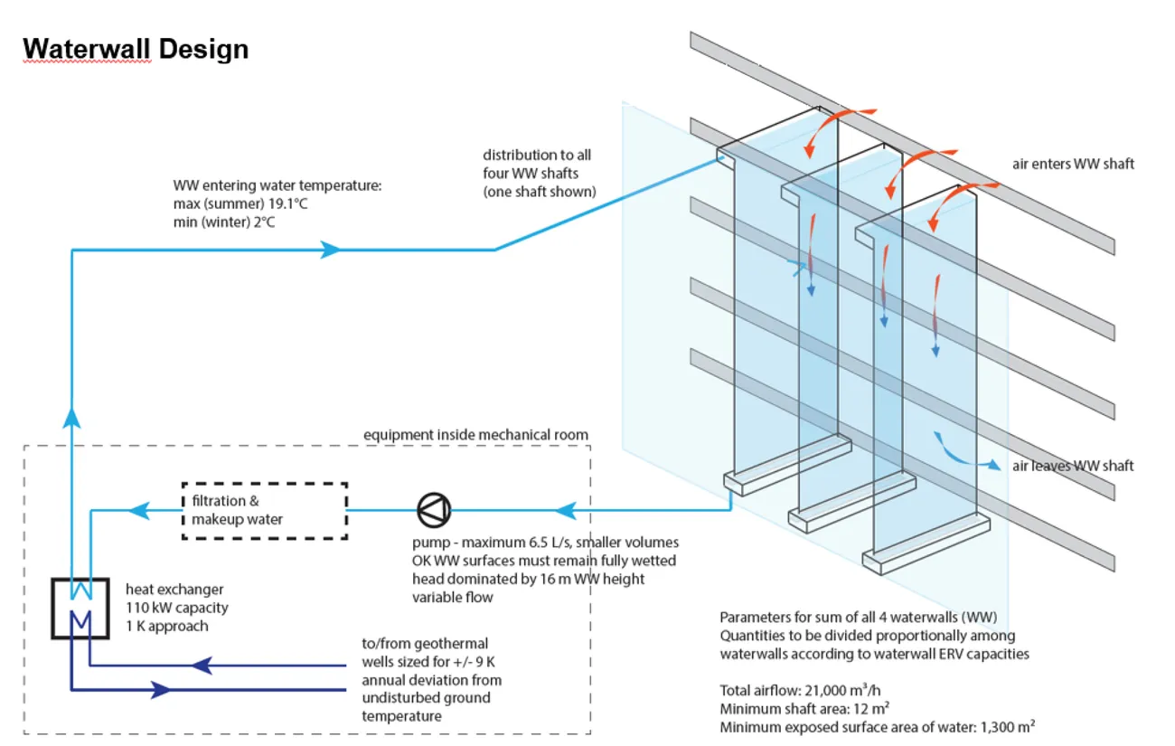 The water walls are coupled with geothermal boreholes, utilizing the relatively stable temperature of the groundwater to condition the supply air as it flows along the water through the transparent glazed shafts.