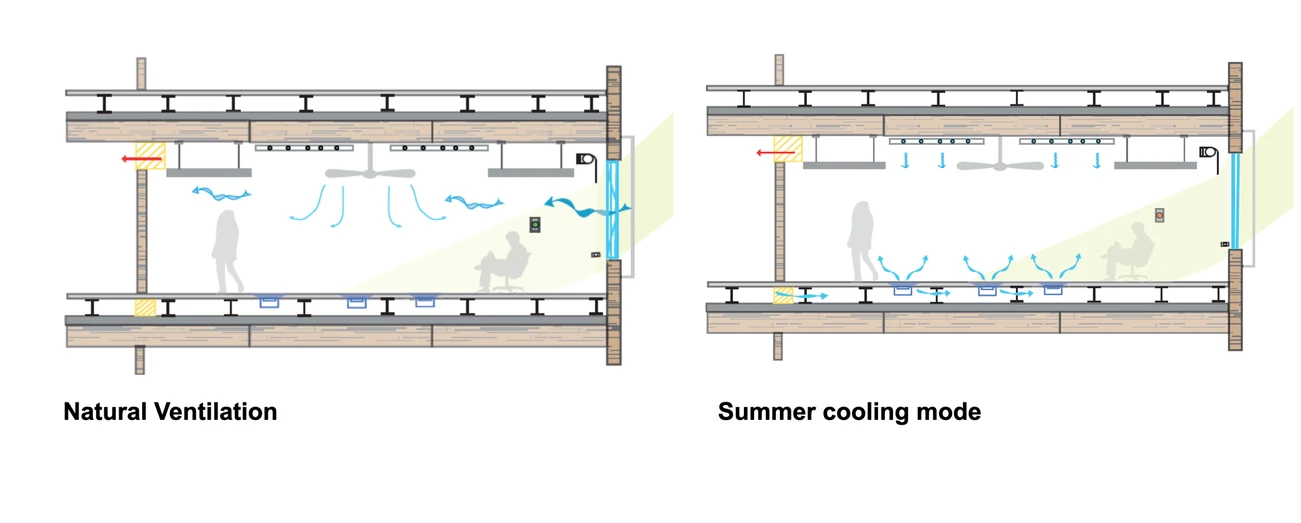 The building incorporates raised floors to support mechanical ventilation, while radiant ceiling panels provide heating and cooling. Instead of a centralized HVAC system, each floor is equipped with two energy-recovery ventilators (ERVs). In active mode, fresh air is delivered into the plenum beneath the raised floors, and room vents automatically open when spaces are occupied, distributing air efficiently throughout the building while the radiant panels maintain comfortable temperatures.