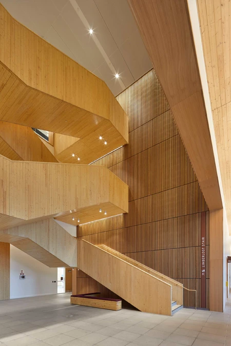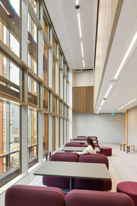 Limberlost Place is a ten-storey academic building housing George Brown College’s School of Architectural Studies. It's Ontario’s first mass-timber, low-carbon institutional building. The building brings together a diverse mix of classrooms, an athletic centre, childcare- and event facilities, offering students and researchers a hands-on environment to design, build, and study climate-friendly buildings.