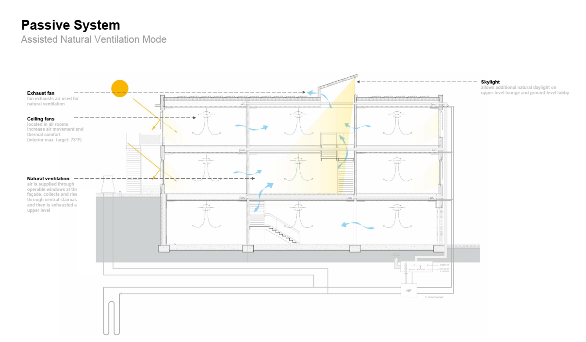 Tracking for LEED Gold certification, a high-performance envelope increases resiliency while minimizing the energy consumption of the building. Controlled WWRs (window-to-wall ratios) together with bird friendly triple glazing and exterior movable venetian blinds allow to minimize thermal losses in winter as well as solar gains in summer. All the windows are manually operable to allow for periods of natural ventilation. When outside conditions are not favorable (too cold or too hot and humid), a DOAS unit with a high-performance heat recovery injects treated outside air in each room, according to their occupation. Space conditioning is provided by a mixture or radiant panels and radiant floors. Hot and chilled water is generated by a water-to-water heat pump coupled with 4 boreholes 500 feet deep. The resulting efficiency of this all-electric approach allows for the on-site photovoltaic panels on the rooftop minimize the total operational carbon emissions of the building.
