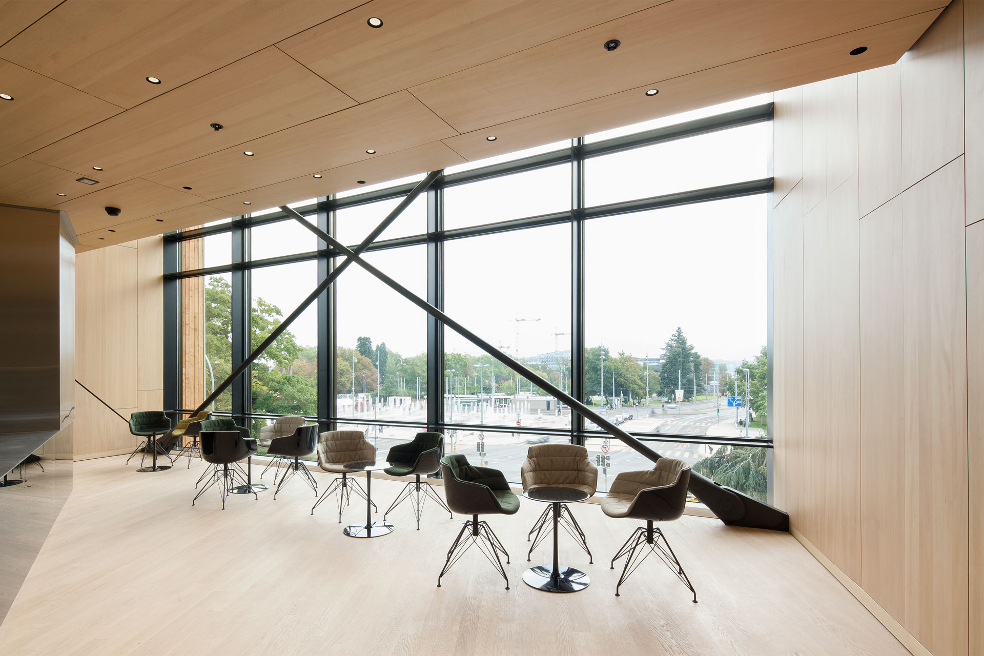 The low ratio of embodied energy required also played an important role, as did the thermal characteristics and haptic qualities of the material. Its small proportion of thermal mass and subsequently its short response period is advantageous for the intensive utilization of the building during conferences and the phases in between. The synergies between the wooden supporting structure and the technical construction are shown for example in the utilisation of existing cavities resulting from the structure, which are used to direct the air. In connection with radiative cooling surfaces, the efficient displacement ventilation provides a high level of comfort for the user with minimum use of energy. The renewable cooling energy will be drawn from Lake Geneva.