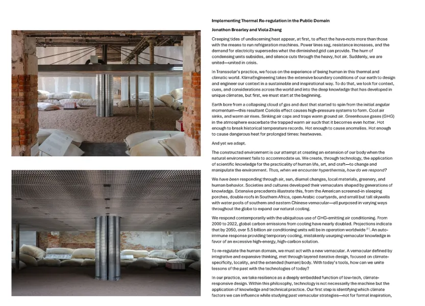 Transsolar associates, Jonathon Brearley and Viola Zhang, were invited to contribute to the publication. Their essay draws from Transsolar's current and previous work in climates with extreme heat conditions to contemplate the need for a "new vernacular". Brearley and Zhang opine on the role of technology in a passive-first, low-tech, warming world. They argue that the role of technology ought to be rooted in praxis rather than product. From Singapore to Damascus, they reflect on the process of learning, designing, and implementing low-tech cooling methods that emphasize the potential of starting simple, examining context, and borrowing across borders.