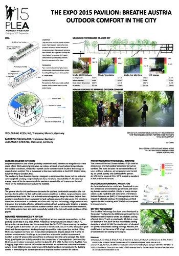 Evapotranspiration is one of the (probably underestimated) elements to mitigate urban heat island effect. Well watered green areas can reduce ambient air and radiant temperatures. For outdoor conditions, elevated air speeds can be combined with Dry Mist Technology to create human comfort. This is showcased at the Austrian Pavilion at the EXPO 2015 in Milan, Italy from May to October 2015. The pavilion by Team.Breathe.Austria is designed as simple wooden frame built on a slender concrete plinth creating an open enclosure for a miniature forest of 560 m². All electrical energy required for the operation of the pavilion is provided by a PV system on the roof. There are no mechanical cooling systems installed.