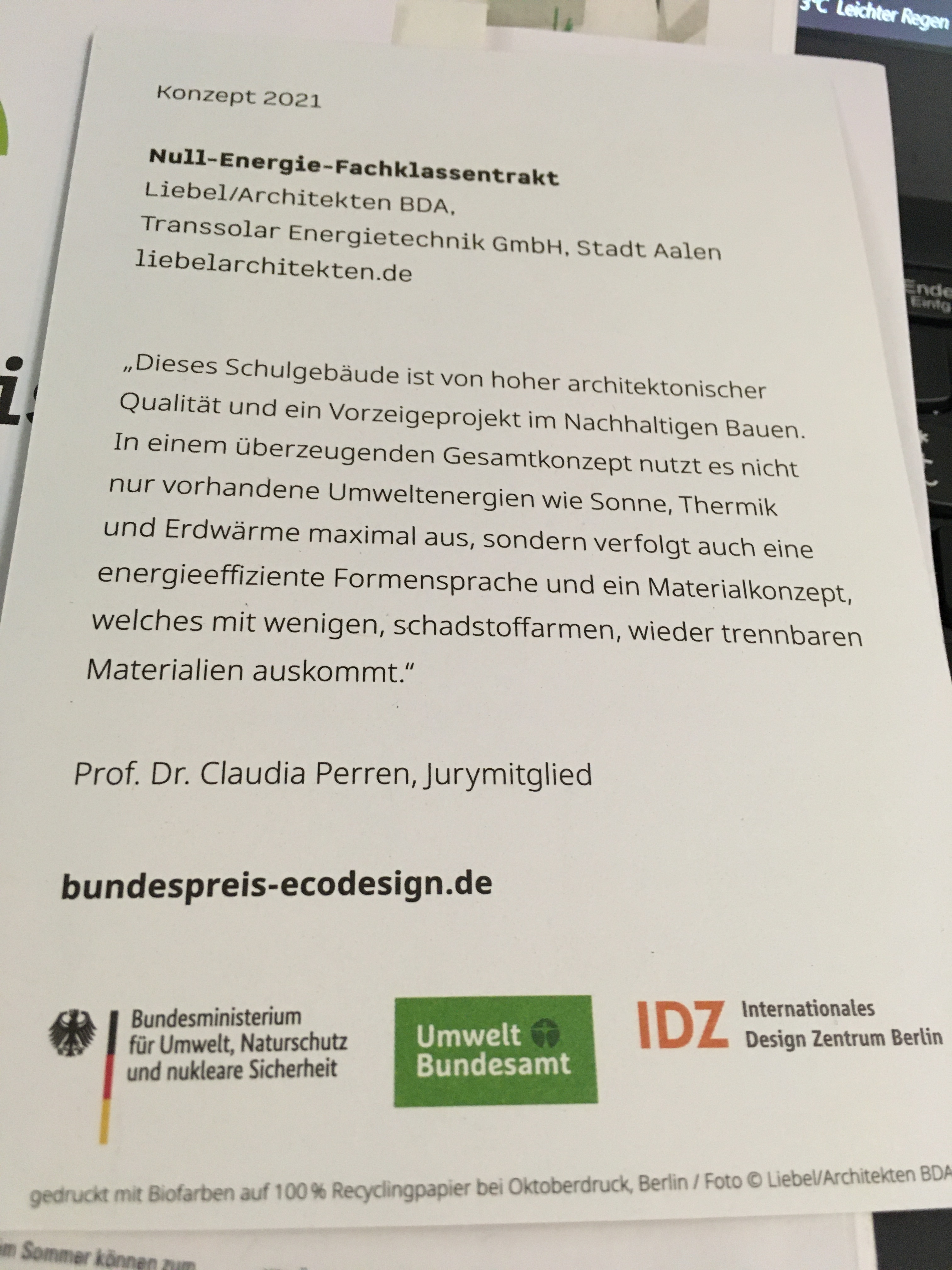 Und zwar den „Bundespreis Ecodesign“ für das Projekt Fachklassentrakt Schubart-Gymnasium in Aalen mit Liebel/Architekten.