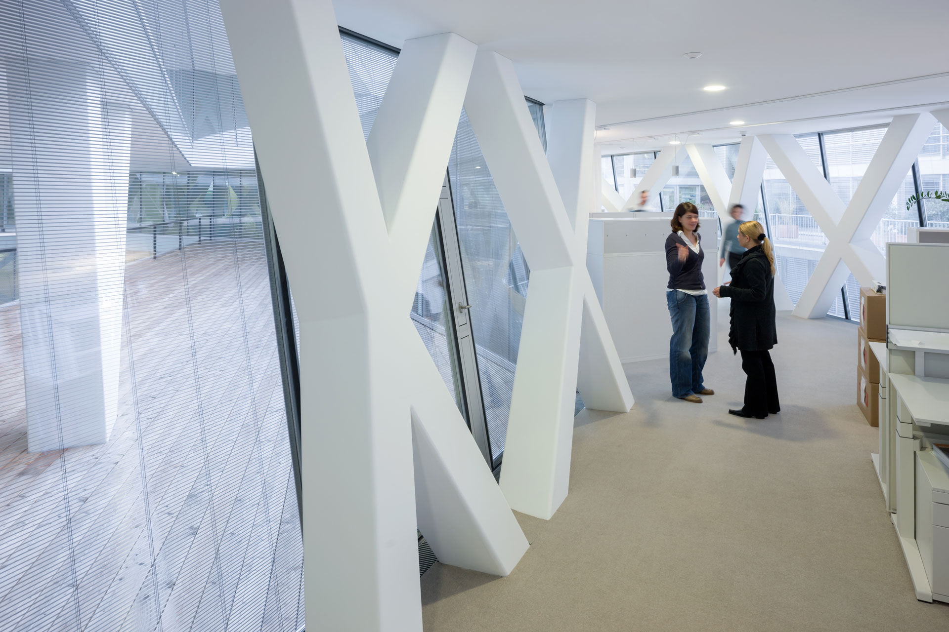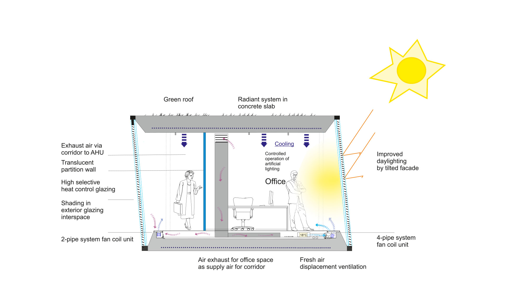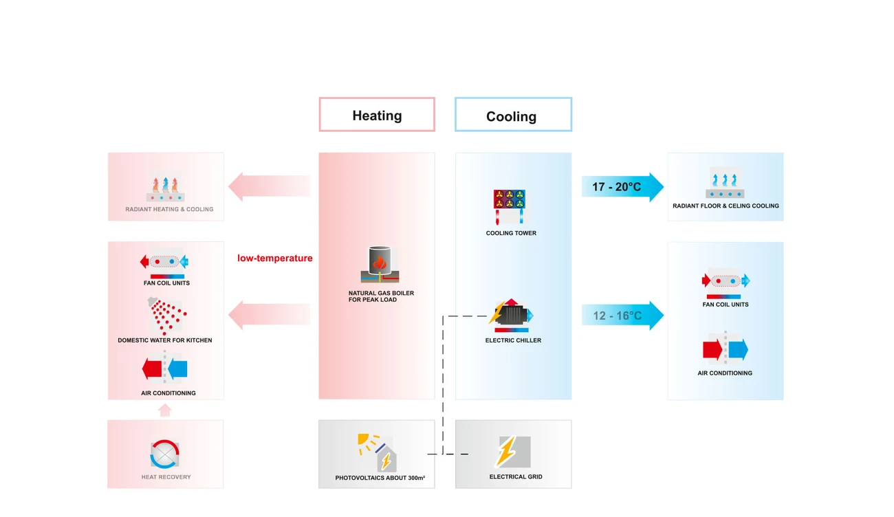 Das Energiekonzept beruht auf einer kombinierten Nutzung von Abwärme, Erdgas und erneuerbaren Energien in Form von Solarstrom. Ziel ist eine ressourcen-schonende und weitestgehend CO2-reduzierte Deckung des Wärme- und Kältebedarfs. Eine wesentliche Komponente des Fassadenkonzeptes ist eine Dreifach-Verglasung mit einer in den äußeren Scheibenzwischenraum integrierten, motorisch-beweglichen Sonnenschutzstore. Jeder Nutzungsbereich besitzt individuell öffenbare Fensterelemente. Die Glasfassaden sind zudem so konstruiert, dass die solar exponierten Flächen in den oberen Geschossen zum Boden geneigt sind, um den externen Wärmeeintrag zu reduzieren. Eine thermische Aktivierung der massiven Betondecken wird durch eine Individuell regulierbare Umluftheizung- / kühlung unterstützt. Das in den Doppelboden integrierte Umluftaggregat speist sich durch die Deckenabluft und fährt daher luftseitig mit maximaler Temperaturspreizung. Zur Minimierung von vertikalen Schachtflächen ist die mechanische Lüftung dezentral und geschoß-spezifisch ausgebaut. Die Abluft beruht auf der Überströmung in die Flure und verzichtet gänzlich auf eine Kanalführung.