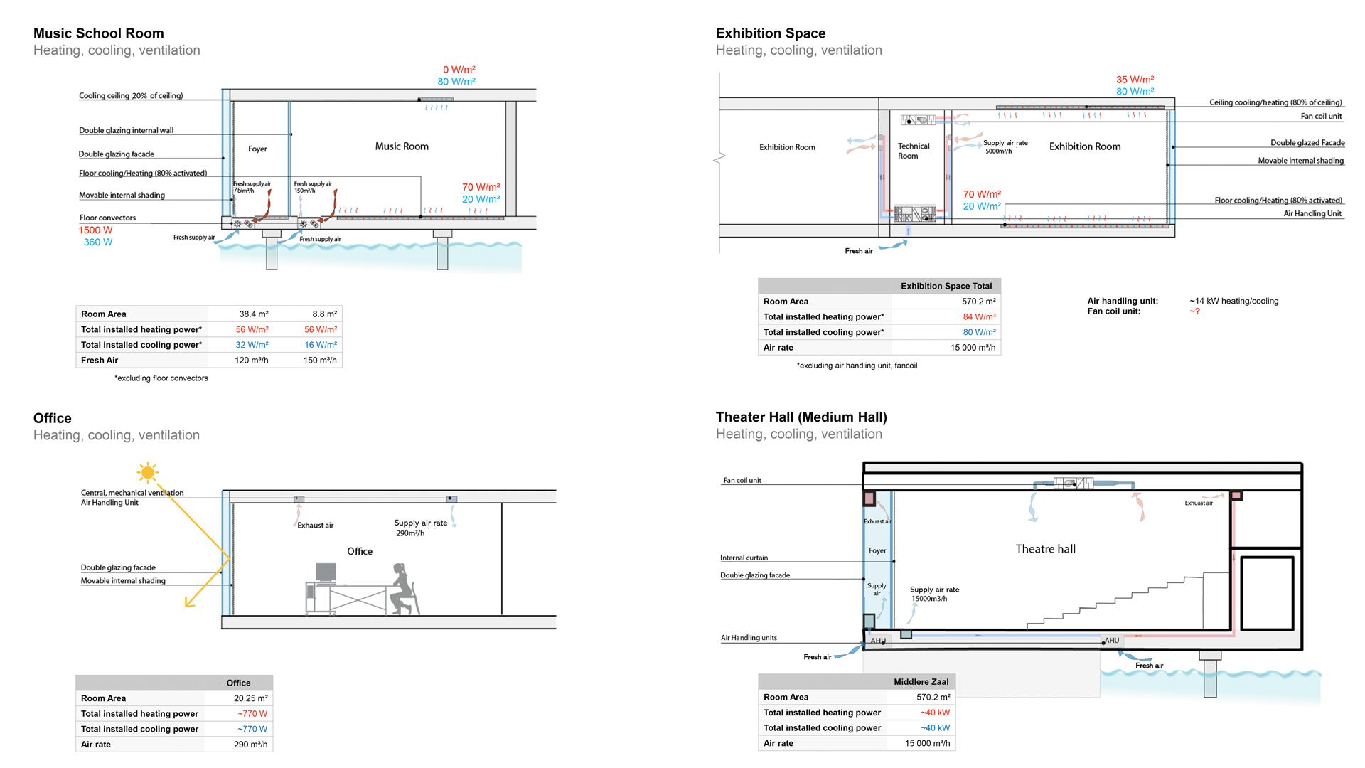 Der Fokus der Sanierung liegt auf der Verbesserung des Sommerlichen Komforts bei Vermeidung eines außenliegenden Sonnenschutzes, der angesichts der Windexposure auch funktional fraglich wäre. Transsolar empfiehlt den innenliegenden Sonnenschutz zu automatisieren und die Luft, die sich im Spalt zwischen Glas und Sonnenschutz erwärmt, oberhalb des Spalts abzusaugen. Dieses Prinzip wurde bereits beim Projekt Hauptverwaltung Continental demonstriert. Es verringert den Eintrag von Solarenergie um bis zu 60%. Ein positiver Nebeneffekt dessen, ist eine verbesserte Verteilung der konditionierten Zuluft v.a. in der Kunstaustellung. Für die Büros werden außerdem statt der heutigen Vollkonditionierung nur über Luft effiziente Deckensegel zur Kühlung empfohlen. Das größte Potential für Energieeinsparungen liegt neben dem passiven Überhitzungsschutz in der Implementierung einer CO2-geführten Steuerung der Lüftungsanlagen v.a. in den Foyers sowie in der vollständigen Umrüstung auf LED-Beleuchtung mit Tageslicht- bzw. präsenzabhängiger Steuerung.