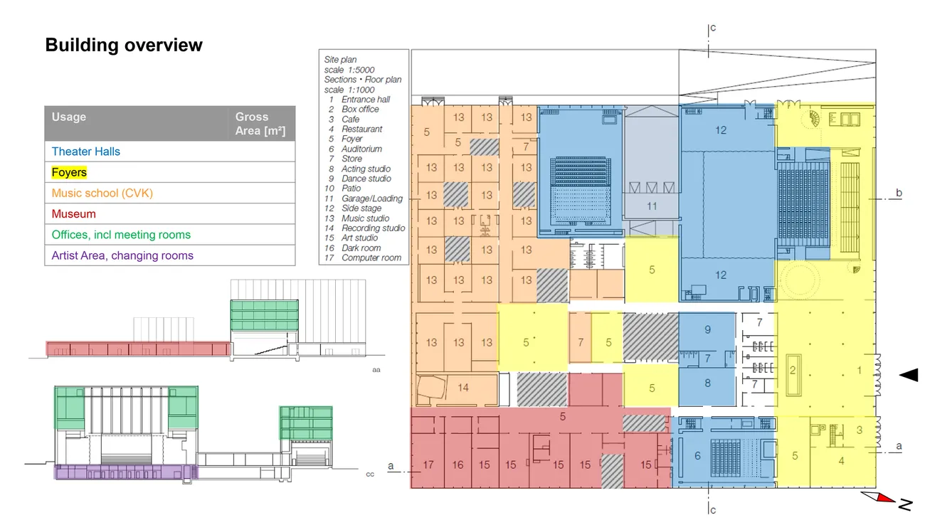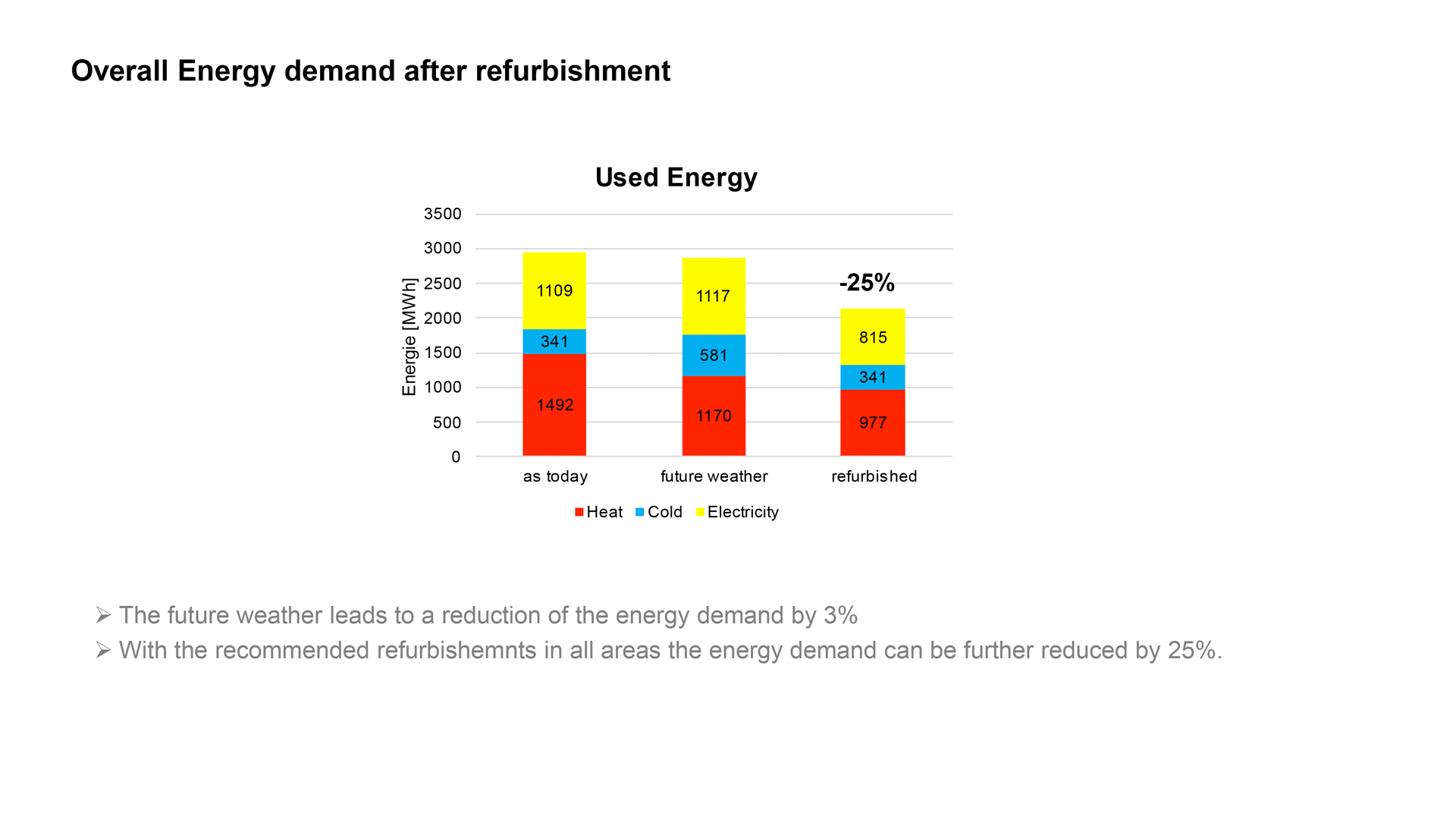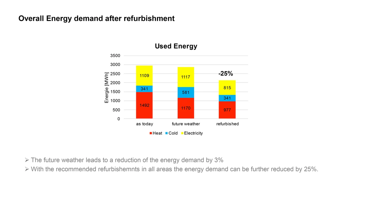 Der Energieverbrauch im Bestand wurde detailliert analysiert und basierend darauf ein Simulationsmodell des Gebäudes erstellt, mit dem die heutigen Verbräuche gut reproduziert werden konnten. Für die Bewertung von Sanierungsszenarien wurde eine Wetterdatenprognose für das Jahr 2050 verwendet. Demnach wird erwartet, dass dann etwa 30% weniger geheizt werden muss, aber ein deutlich höherer Kältebedarf (+60%) herrschen wird. In Sachen Wärme- und Kälteversorgung bedient sich die Kunstlinie bereits über eine Aquifer-Wärmepumpe an natürlichen Ressourcen, ist aber auch an die örtlichen Netze für Fernwärme angeschlossen.