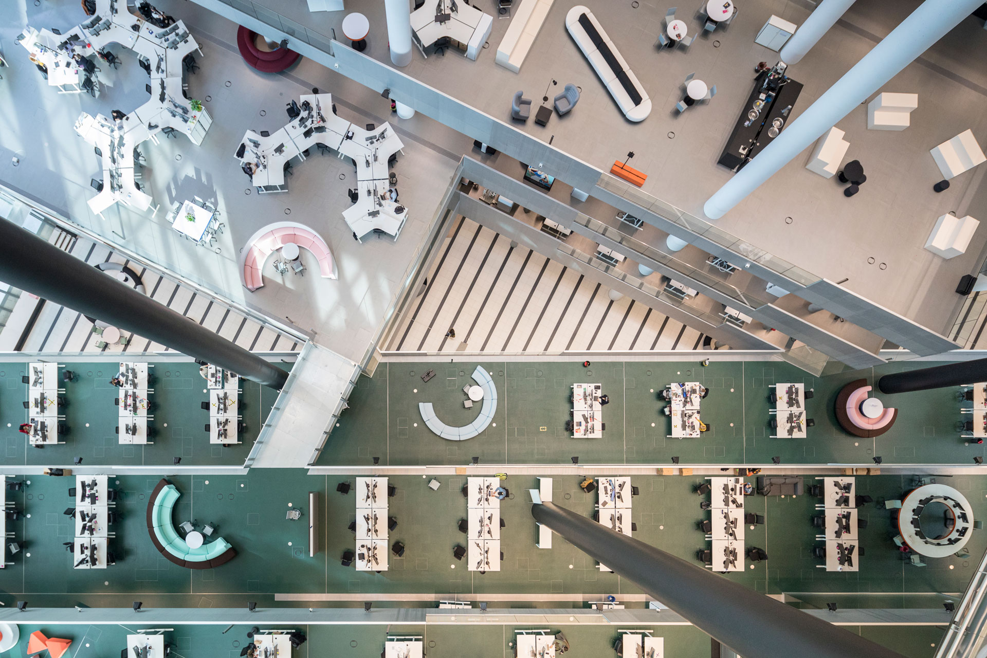 Das anspruchsvolle Raumgefüge des Entwurfes stellte besondere Anforderungen an die Konzeptplanung für die innere Funktion des Gebäudes als moderner Arbeitsplatz. Die hohe räumliche und visuelle Qualität des zentralen Atriums als Tageslichtquelle für das Gebäude als Ganzes auszuspielen war dabei ein Hauptaugenmerk.