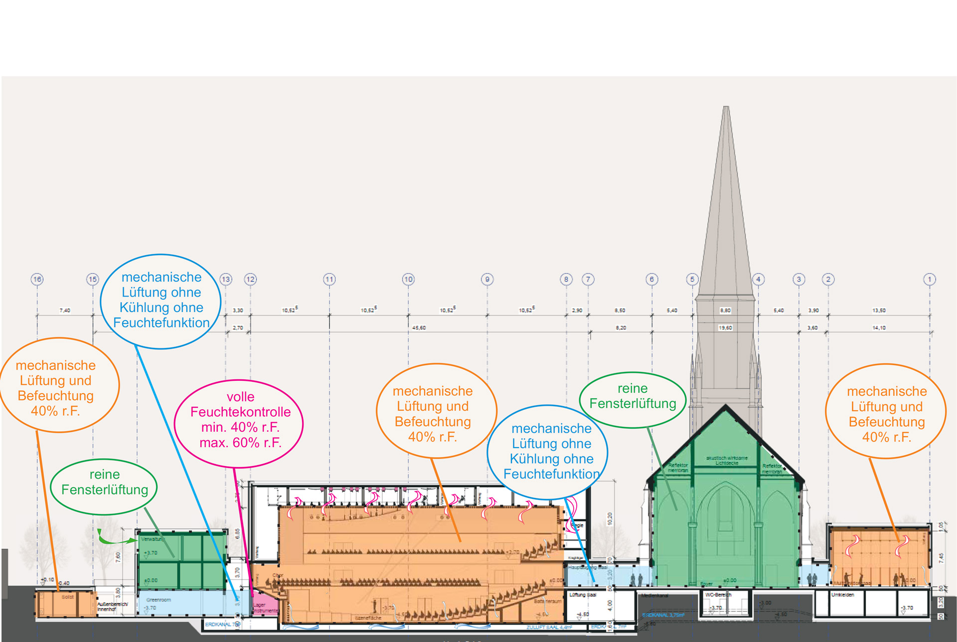 Durch Ist/Soll-Vergleich der Systemtemperaturen wird entschieden, ob der Luft/Erdwärme-Wärmetauscher (kurz: Erdkanal) einbezogen wird. Befeuchtung der Raumluft erfolgt separat nach Bedarf. Der Multifunktionssaal hat eine mechanische Lüftung, aber keine Befeuchtung. Verwaltung und Kirche werden ausschließlich über Fenster gelüftet. Erdwärmetauscher unter der Bodenplatte des Konzertsaals temperieren die Zuluft und senken die Temperatur im Sommer soweit ab, dass angenehme Temperaturen in der Regel unter 25°C bereitgestellt werden. Für die Fortluft wird der Kamineffekt im Kirchturm genutzt. Die Lüftungsanlagen laufen nur, wenn Bedarf besteht, was die CO2 Luftqualitätsmessung ermittelt, oder nach Zeitprogramm. Das Lüftungsgerät verfügt über eine Wärmerückgewinnung.