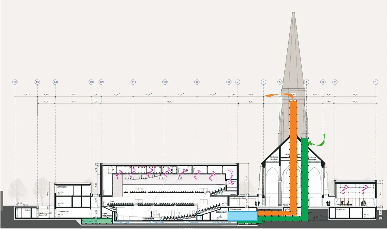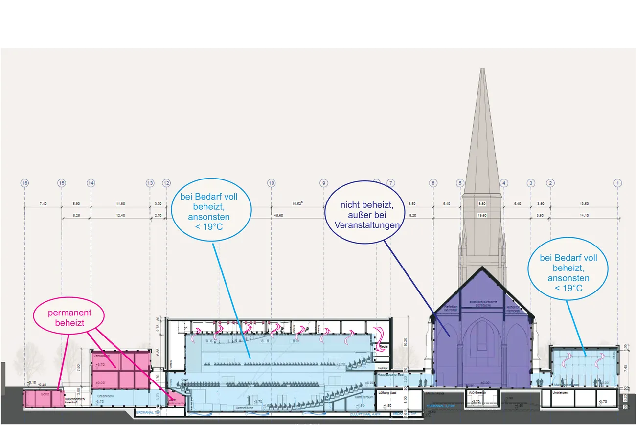 Für das Musikzentrum mit der Marienkirche hat Transsolar ein Konzept erarbeitet, das besonders auf niedrige Betriebskosten ausgerichtet ist und zugleich die Anforderungen für Behaglichkeit beachtet.