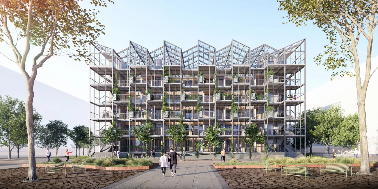 Basis des Gebäudes bildet der Wohnblock aus vorgefertigten Holzmodulen. Die daraus vor Ort zusammengefügten Wohneinheiten sind unterschiedlich groß und reichen von Zweizimmerwohnungen bis hin zu Familienwohnungen. Als Zugänge zu den ~25 Einheiten dienen die vorgesetzten offenen und begrünten Stahlbeton-Laubengänge. Sie verbinden die gemeinschaftlich genutzten Loggias und Freiflächen und ermöglichen auch Bepflanzung. Als Krone über den fünf Wohnungsebenen sitzt das Gewächshaus, das lokal ein Urban-Farming ermöglicht.