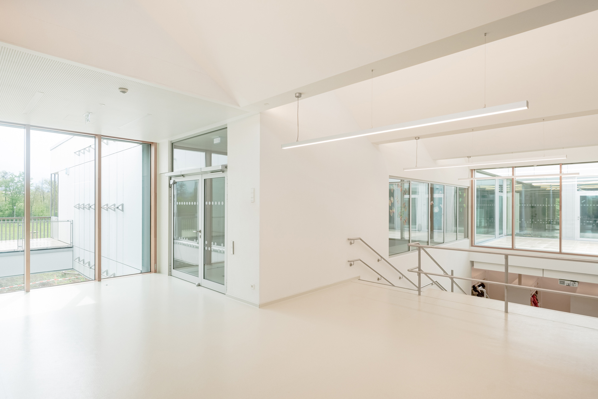 Tageslicht ist äußerst wichtig, weil wir Menschen es zur Konzentration, Wohlbefinden und Leistungsvermögen benötigen. Daher werden die Gruppenräume im Obergeschoss sowohl von der Fassade her als auch über die speziell entwickelten Luft- und Lichtkamine mit Tageslicht versorgt. An den exponierten Fassaden sorgt der außen angebrachte Sonnenschutz mit Tageslichtlenkung vor zu viel des Guten.
