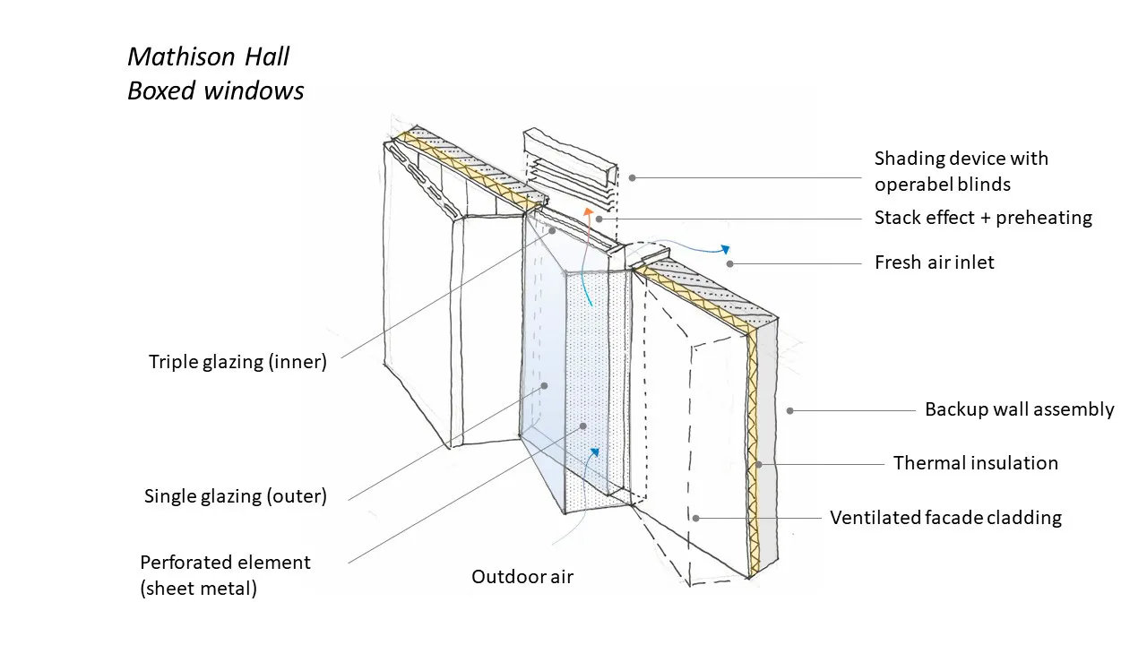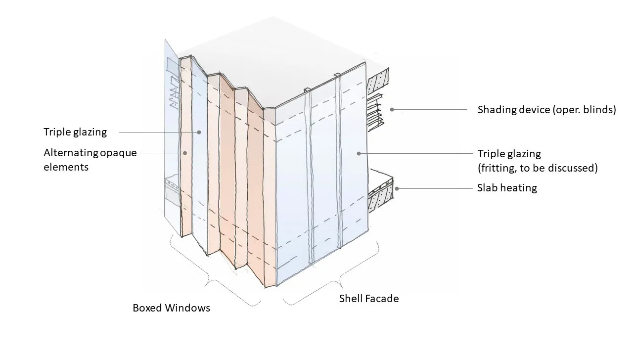 Vier Fassadentypen wurden konzipiert, angepasst an die Anforderungen und Funktion der jeweils angrenzenden Räume. Die Doppelfassade, die der höchsten Sonneneinstrahlung ausgesetzt ist, ist für eine natürliche Belüftung des Atriums des Gebäudes ausgelegt. Sie ermöglicht passive solare Gewinne während der Wintermonate. Die einschalige Fassade der Atriumsbereiche ermöglicht eine natürliche Belüftung und verstärkt diese durch ihren Kamineffekt während der Morgenstunden. Der Veranstaltungsraum ist mit doppelter Höhe gebaut. Wegen der hohen Sonneneinstrahlung in den Übergangszeiten und im Sommer, ist seine Fassade aus verglasten und opaken Elementen zusammengesetzt, optimal für visuellen und thermischen Komfort. Ein Kastenfensterkonzept wurde ausgearbeitet. Klare dreifache Verglasung innen und abgeschrägtes Einfachglas außen integrieren im belüfteten Hohlraum wettergeschützt das Verschattungssystem. Verwirklicht wurde stattdessen eine selektiv beschichtete Dreifachverglasung mit verringertem Flächenanteil und innenliegendem Sonnenschutz.