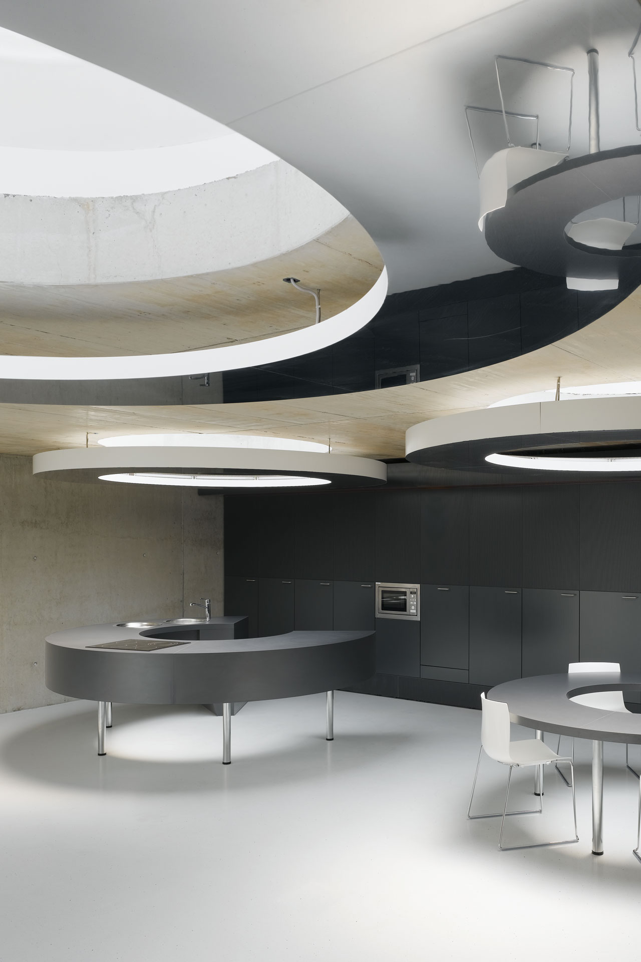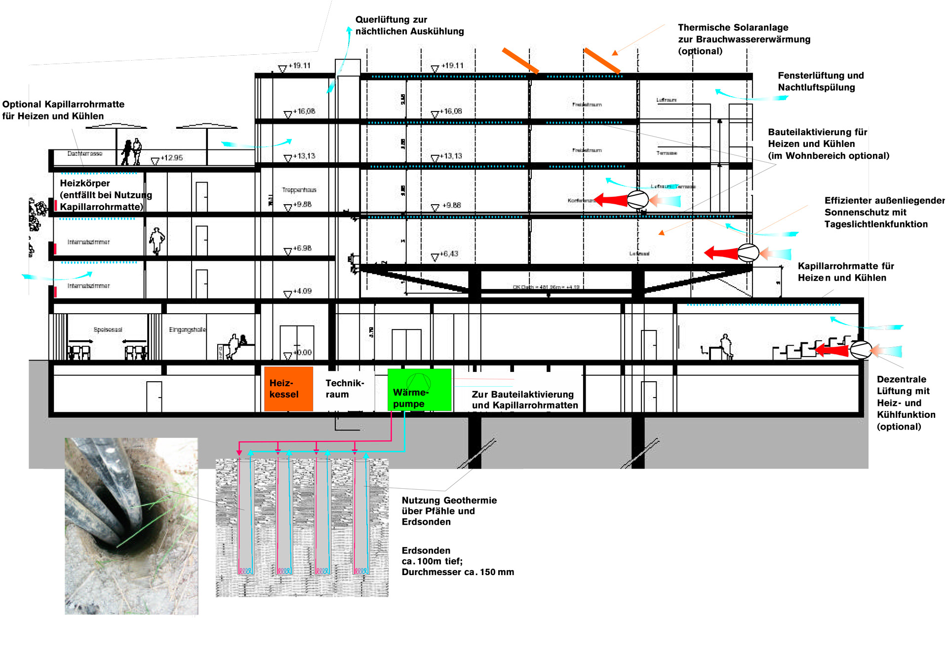 Der Neubau beinhaltet eine Ebene mit Unterrichtsräumen, ein weiteres Geschoss mit Büro- und Verwaltungsräumen bzw. Konferenzräumen und in den oberen zwei Stockwerken befinden sich die Internatszimmer und Gemeinschaftszimmer. Diese orientieren sich zu einem offenen Atrium, das auf der Ostseite in das Gebäude integriert ist. Das Atrium sorgt für ausreichende Tageslichtversorgung der Räume. Die Außenhaut wird regelmäßig durch spezielle Fensterelemente unterbrochen, die in einem feinen Rahmen bündig angeordnet sind und über weiße, geschlossene zweischalige Seitenteile eine schallgeschützte Dauerbelüftung der Räume gewährleisten.