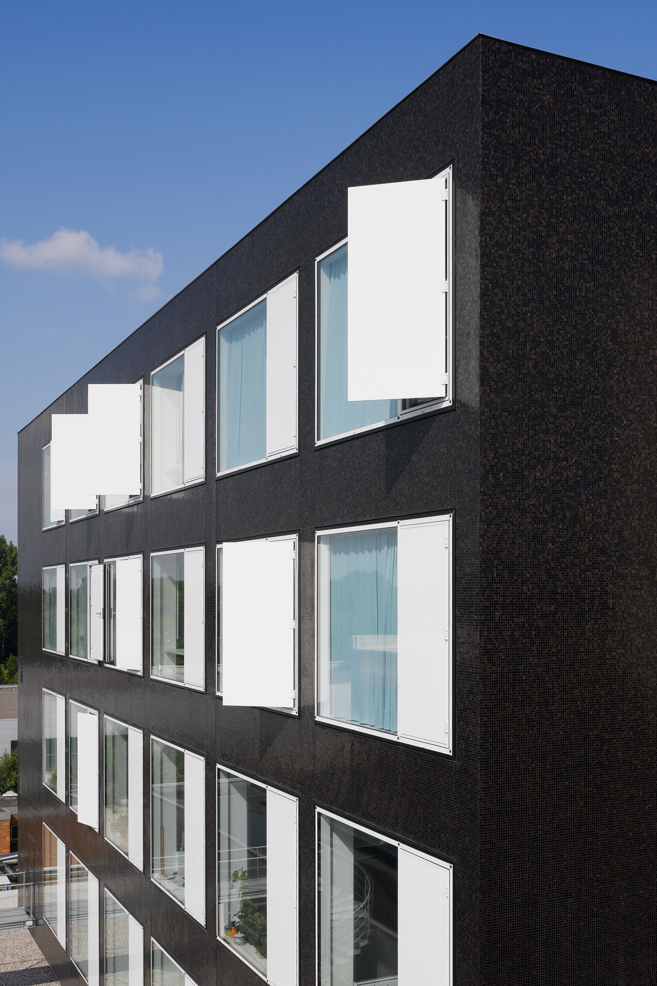 Die Betonfertigteilfassade der Altbauten wurde abgenommen und so konnte in diesem Zuge auch eine energetische Sanierung ermöglicht werden. Der erdgeschossige Werkstattbereich und der 4-geschossige Internatsbaukörper wurden von den kleinen Anbauten befreit und mit einer Klinkerfassade bekleidet, die optisch und technisch nachhaltig ist. Das Innere wurde nach heutigem Standard saniert.