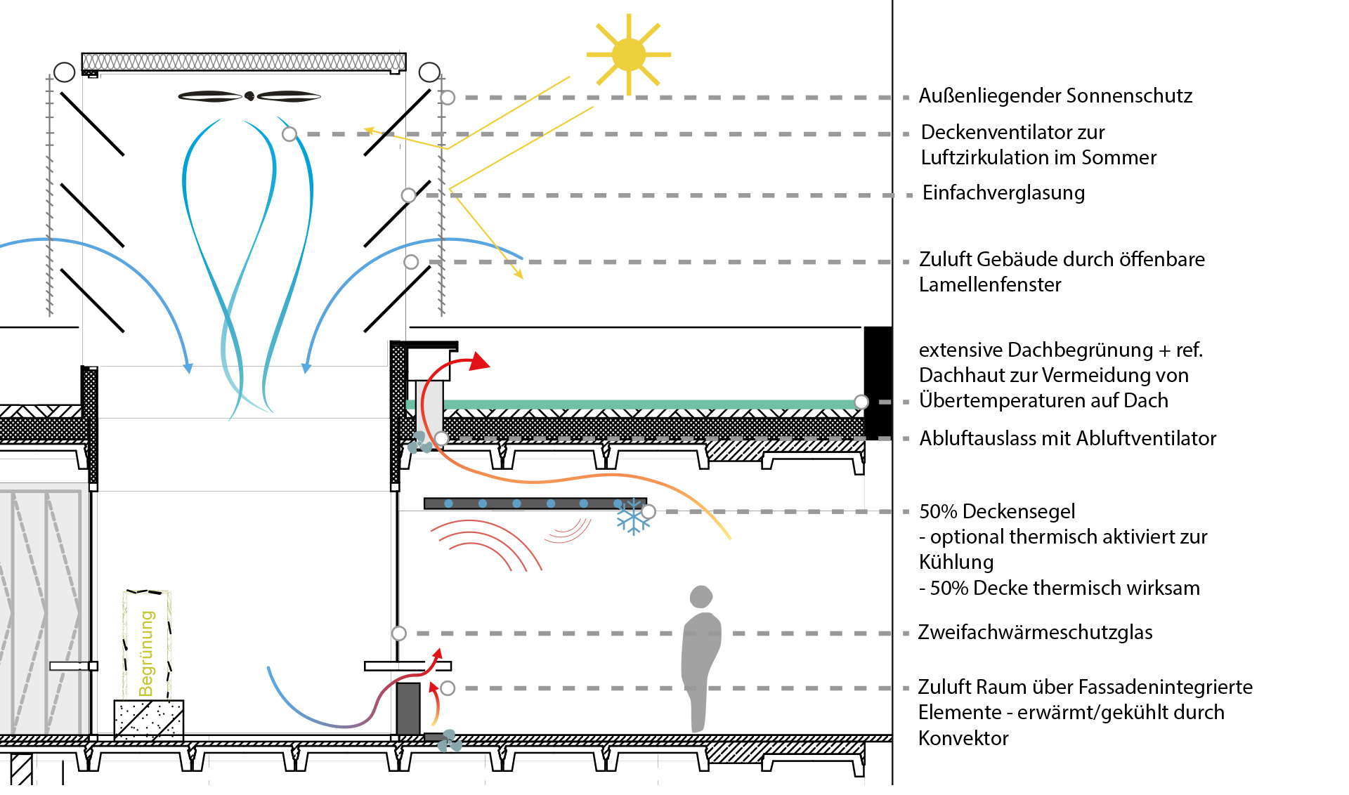 Wesentliche Konzeptelemente sind neben den eingeschnittenen Klima- und Lichtboxen, thermisch aktivierte Bodenflächen mit Heiz- / Kühlfunktion und Deckenventilatoren. Hinzu kommt eine CO2-kontrollierte Lüftung, die zu den Boxen hin über ventilierte Fassadenelemente mit Heiz- / Kühlfunktion erfolgt. Am Perimeter sind manuell regelbare Fassadenklappen für eine Spalt- und Intensivlüftung vorgesehen sowie Brüstungsheizkörper.