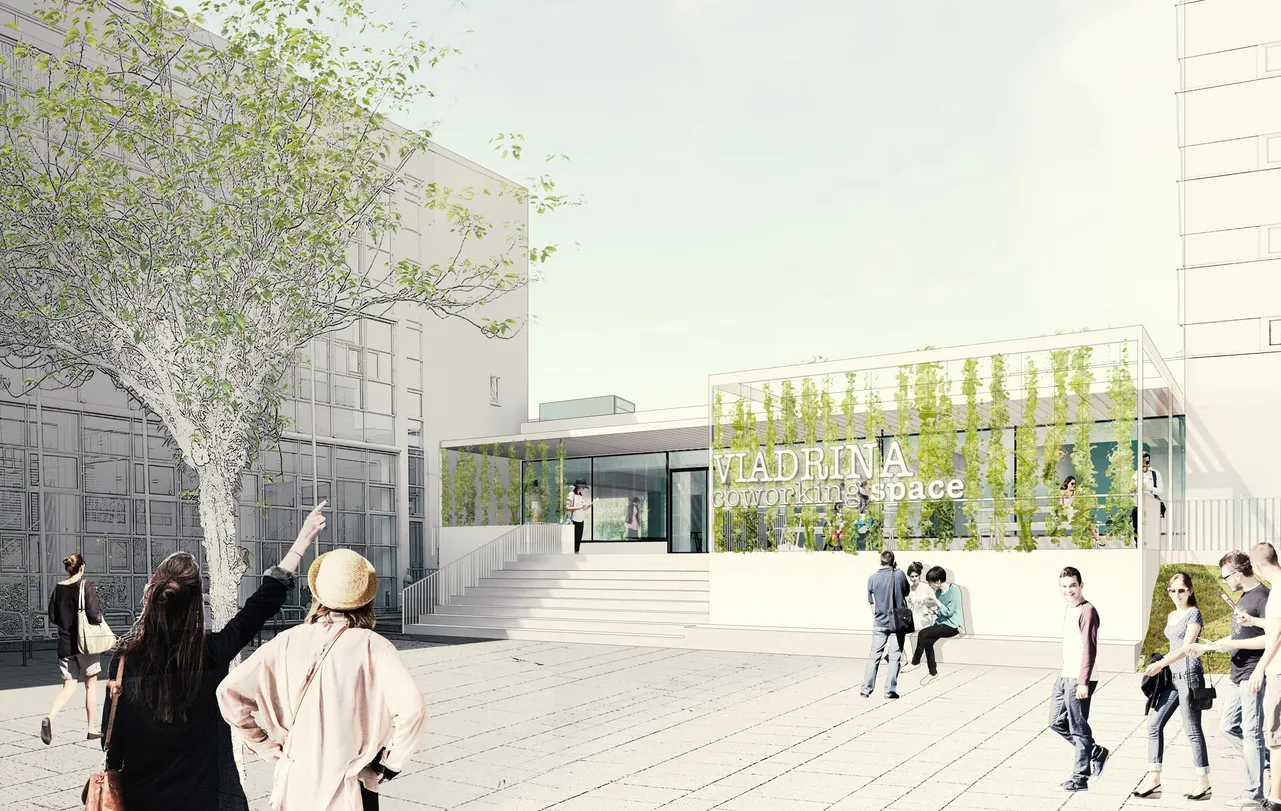 Das Bestandsgebäude „Alte Mensa“ mit UG und EG ist Teil eines zusammenhängenden, dreiteiligen Gebäudekomplexes mit Studentenwohnheim und Audimax. Die drei Gebäudeteile wurden Ende der 1970er Jahre als SED-Bezirksparteischule in Skelettbauweise erbaut. In den 90er Jahren erfolgte ein Umbau zu einem Hotel‐ und Kongresszentrum. Zur Jahrtausendwende übernahm die Europa‐Universität Viadrina das Gebäude und nutzte es als Mensa.