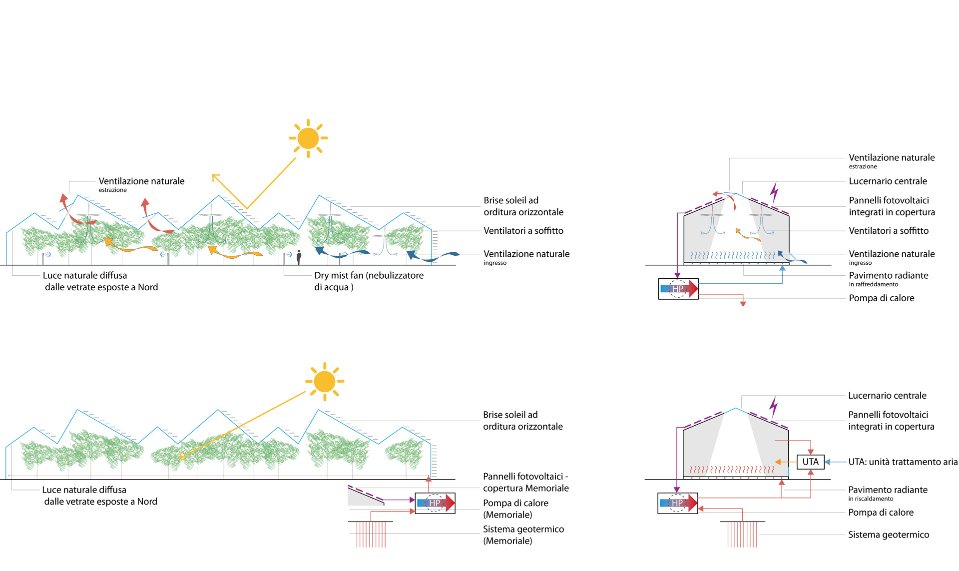 In der Gedenkstätte klimatisiert ein Fußbodenheizungs- und Kühlsystem nur im unteren Teil des Raumes, also in dem Teil, den die Besucher tatsächlich nutzen. Dies vermeidet, dass die gesamte Luftmenge konditioniert wird und spart Energie ein. Eine reversible Wärmepumpe versorgt dieses Strahlungssystem, sie tauscht Wärme mit dem darunter liegenden Erdwärmesystem aus und erhält ihre Antriebsenergie durch Photovoltaikpaneele auf dem Dach. Für frische Luft sorgt im Winter mechanisch ein RLT-Gerät, gleichfalls von der Wärmepumpe gespeist. Im Sommer hingegen wird das Museum rein auf natürliche Weise gelüftet, über Öffnungen an der Unterseite sowie Oberlichter. An besonders heißen Tagen steigern Deckenventilatoren die Luftbewegung und senken die gefühlte Temperatur. Das zentrale Oberlicht sorgt für eine diffuse natürliche Beleuchtung.