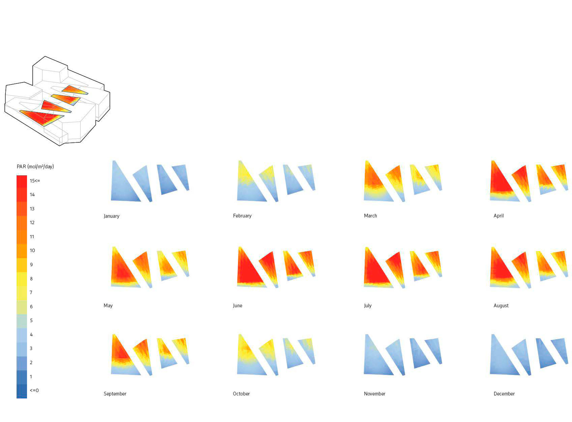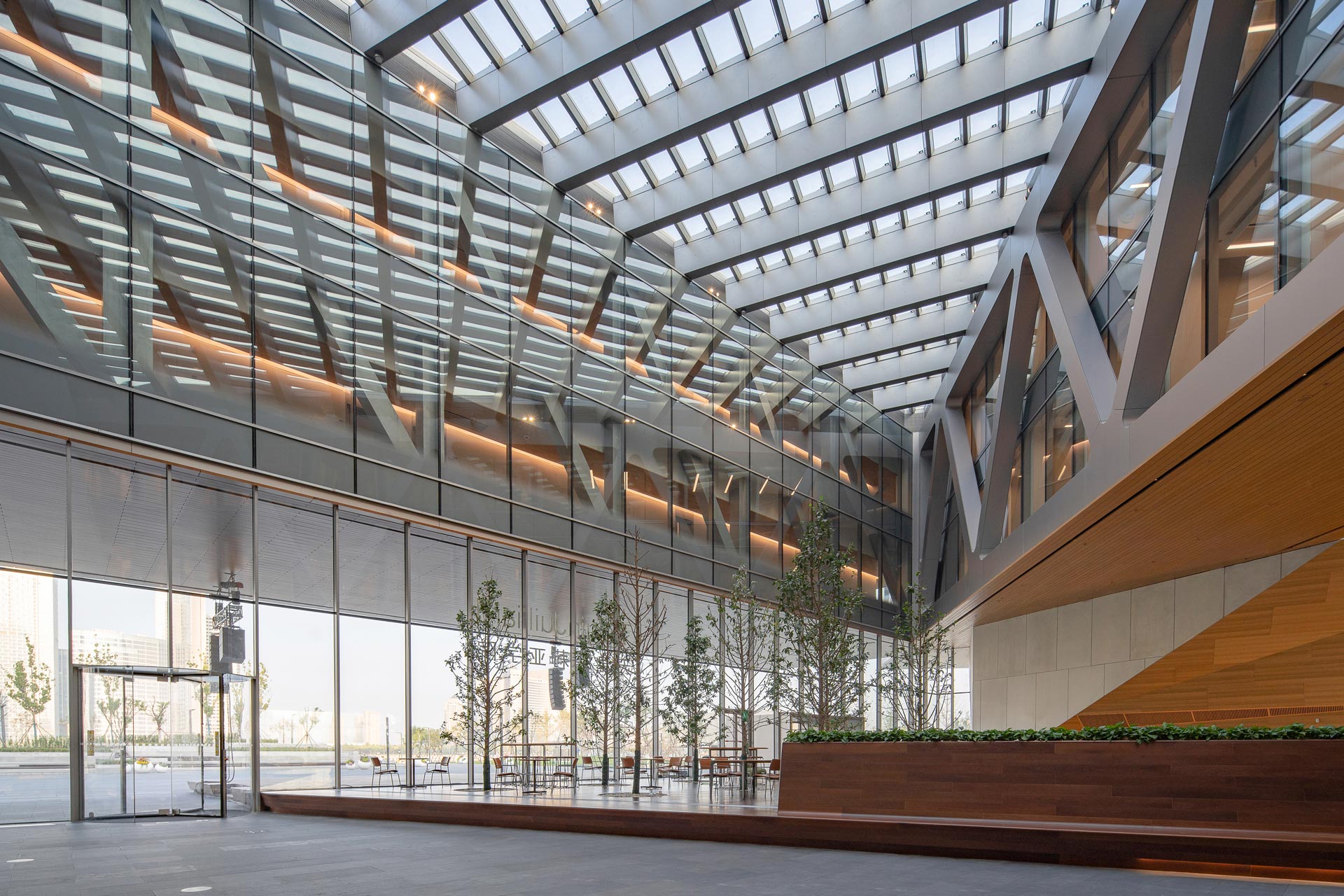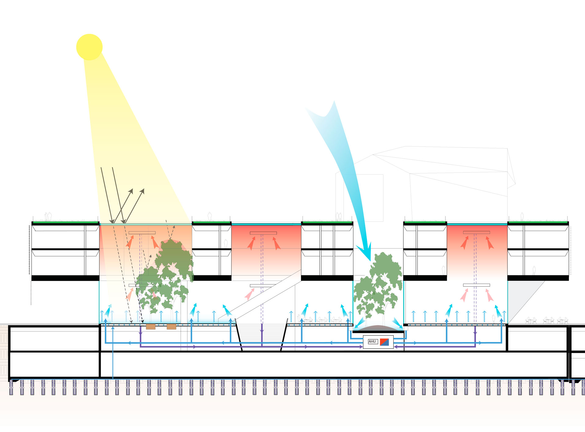 Die begrünte Lobby erweitert den Park ins Gebäude hinein und dient als klimatische Pufferzone des Eingangs. Große Oberlichter lassen Licht in die Eingangshalle, ausreichend auch für Pflanzen, die sonst nur im Freien wachsen. Verzicht auf Verschattungen sorgt für maximales Licht. Man befindet sich im Inneren, fühlt sich aber wie im Freien. Entstehende Wärme fängt das im Boden integrierte Kühlsystem ab und leitet sie über Bohrpfähle ans Erdreich ab. Diese Low-Tech-Lösung ermöglicht die architektonische Vision der Transparenz.