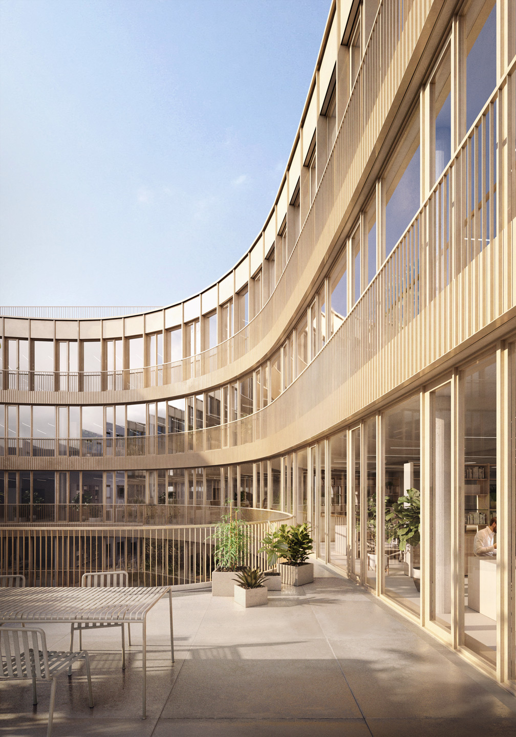Zentraler Punkt dieses Entwurfs ist eine einzigartige Doppelfassade mit Blick auf die belebte Sonnenstraße und einen durchdacht gestalteten Innenhof. Das Klimakonzept des Gebäudes betont die natürliche Belüftung, den akustischen Komfort und die passiven solaren Gewinne im Winter und bietet eine nachhaltige und effiziente Arbeitsumgebung.