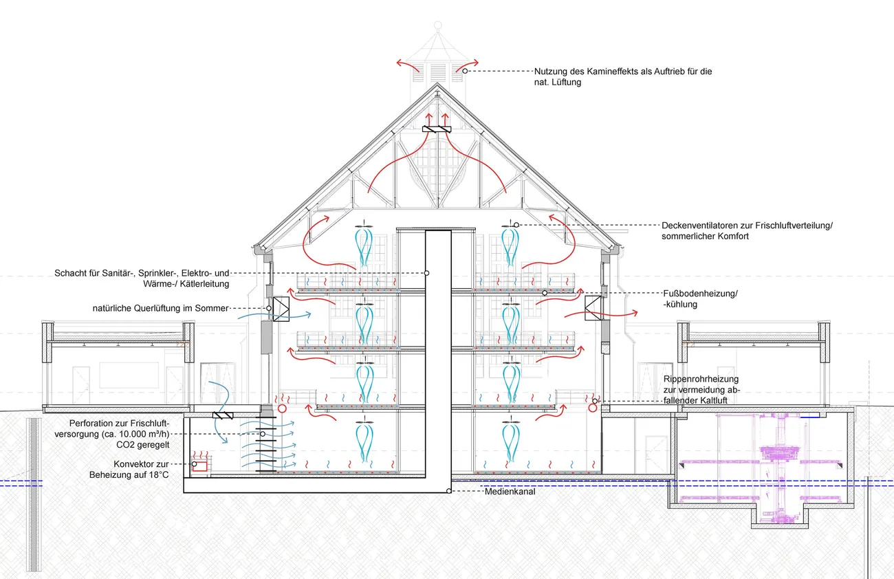 Das Klimakonzept von Transsolar zielt auf minimalen technischen Aufwand. Für die rein natürliche Belüftung gelangt Frischluft über eine horizontale Öffnung in den Zuluftschacht im Untergeschoss. Hier wird über Heizregister die Luft vorgewärmt und strömt dann in die Büroräume UG. Angetrieben durch den natürlichen Auftrieb gelangt die Luft von dort durch alle Geschosse und über das Dach nach draußen.