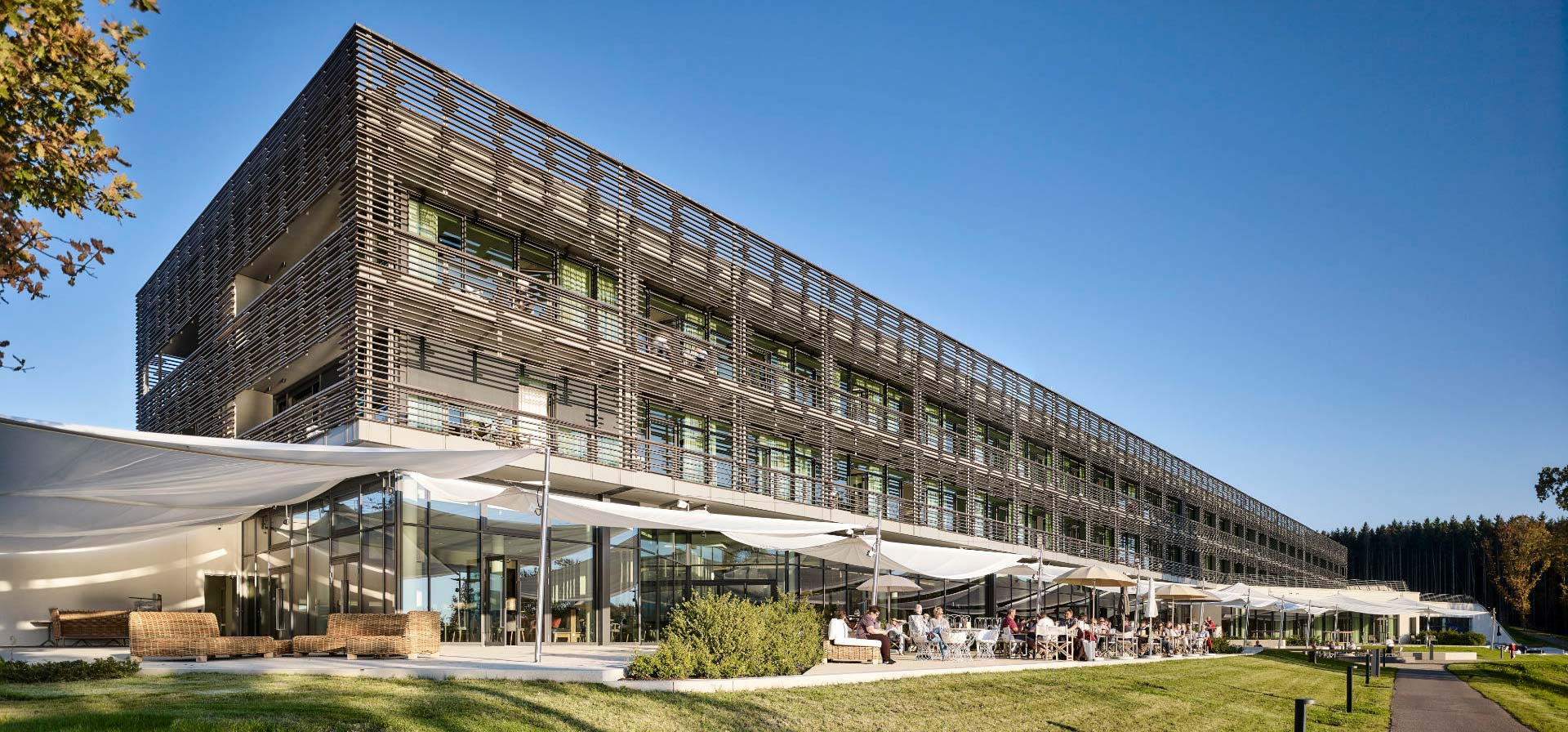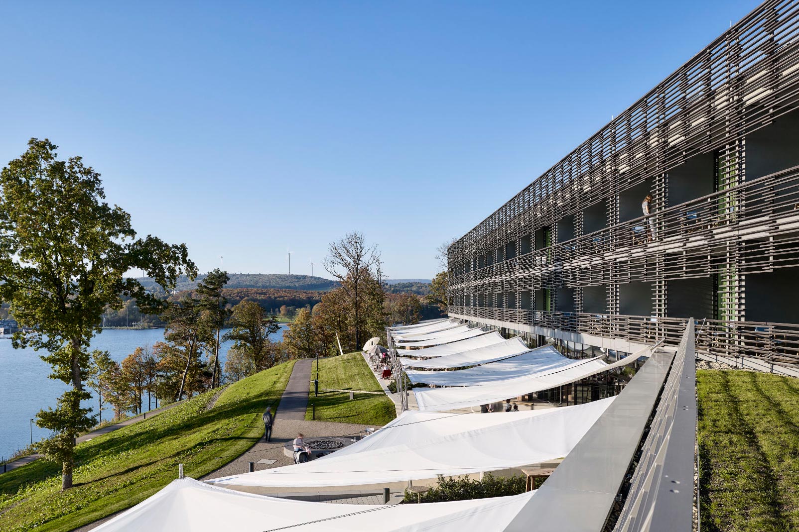 Das neue Hotel am Bostalsee, einem Erholungsgebiet im Saarland, ist seit Juni 2017 unter dem Namen „Seezeitlodge Hotel & Spa“ eröffnet. Die herrliche Aussicht vom kleinen Kap auf den See allein reicht für einen erfolgreichen Hotelbetrieb nicht aus. Das Vier-Sterne-Hotel hat 100 Zimmer und Suiten, einen 2.000 m² großen Spabereich, Gastronomie und mehrere Tagungsflächen. Transsolar hatte in der Planung die beratende Aufgabe, dafür zu sorgen, dass die Gäste zufrieden sein können mit Aufenthaltsqualität und Behaglichkeit im Gebäude hinsichtlich Wärme, Licht und Luft. Gleichzeitig müssen geringe Energie- und Wartungskosten gesichert sein. Der Neubau sollte zeigen, dass ein hoher Komfort ohne erhöhten Energiebedarf möglich ist und gleichzeitig ökologisch tragfähig. Transsolar nutzte thermische, Strömungs- und Tageslichtsimulation, um das Energie- und Komfortkonzept iterativ zu entwickeln, also wiederholend mit schrittweisen Änderungen, gemeinsam mit dem Architekten und dem Bauherrn. Eine Herausforderung bestand darin, die standortprägende freie Sicht auf den See zu erhalten, während der sommerliche Wärmeeintrag in das Gebäude unter Kontrolle bleiben muss. So wurden die Balkone der Hotelzimmer und die vorgehängte Holz-Lamellen-Struktur in Bezug auf Sonnenschutz, Tageslichtnutzung als auch Sichtbeziehung optimiert. Vor dem Erdgeschoss sind motorisierte Großsegel installiert, die bei Bedarf Schatten spenden: Der Terrasse, den Fassaden, der Lobby, dem Restaurant und den Veranstaltungsräumen - bei dennoch freier Sicht und freiem Durchgang. In den Hotelzimmern besteht die Grundbeheizung und -kühlung in Form von Betonkern-Aktivierung: Die Zimmerdecken selbst dienen als Heiz- bzw. Kühlkörper. Im Winter können die Räume individuell über dezentrale Konvektoren temperiert werden. Ist es warm genug, können die Fassaden großflächig geöffnet werden. Alle Zonen des Gebäudes werden bedarfsgerecht je nach Außentemperatur mechanisch oder natürlich gelüftet. Die Hotelzimmer werden in Abhängigkeit der Belegung über dezentrale Abluftventilatoren mit Nachströmung über die Fassade gelüftet. Den Grundbedarf an Energie deckt ein gasbetriebenes Blockheizkraftwerk; die Abwärme der Kältemaschine wärmt das Brauch-Warmwasser vor und beheizt Wasser im Wellnessbereich.
