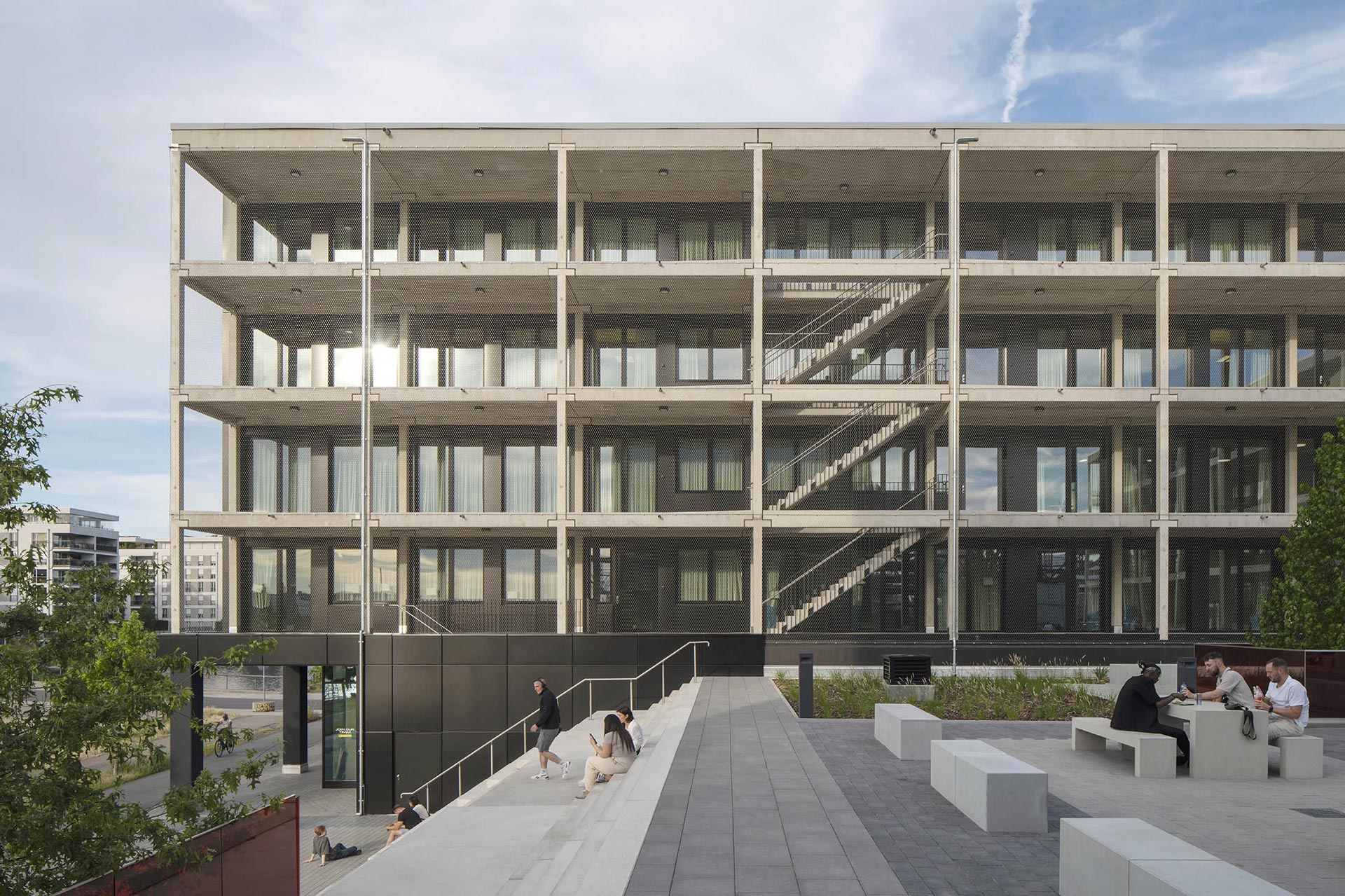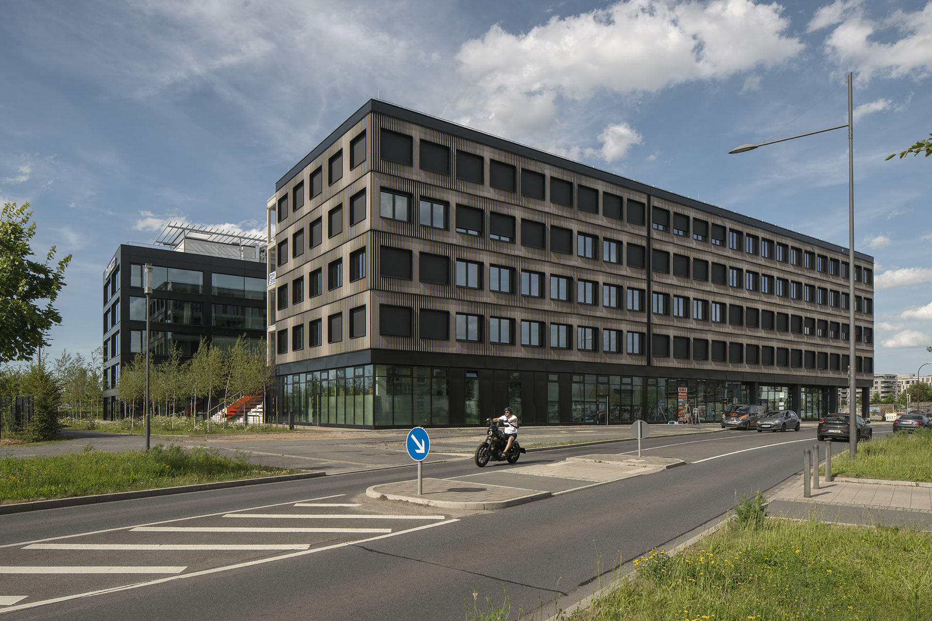 Das Winkelgebäude 'Wood' ist modular aufgebaut und besteht fast komplett aus Holz. Die etwa 500 vorgefertigten und haustechnisch vorkonfektionierten Holzbaumodule ermöglichten eine kurze Bauzeit. Zudem binden die 2.600 m³ Holz eine CO2-Fracht von rund 2.500 t. Auch aus Brandschutzgründen sind die vier Obergeschosse von 'Wood' über außenliegende Laubengänge miteinander verbunden. Sie dienen als Orte der Begegnung und erlauben über die Geschosse interdisziplinäres Arbeiten.
