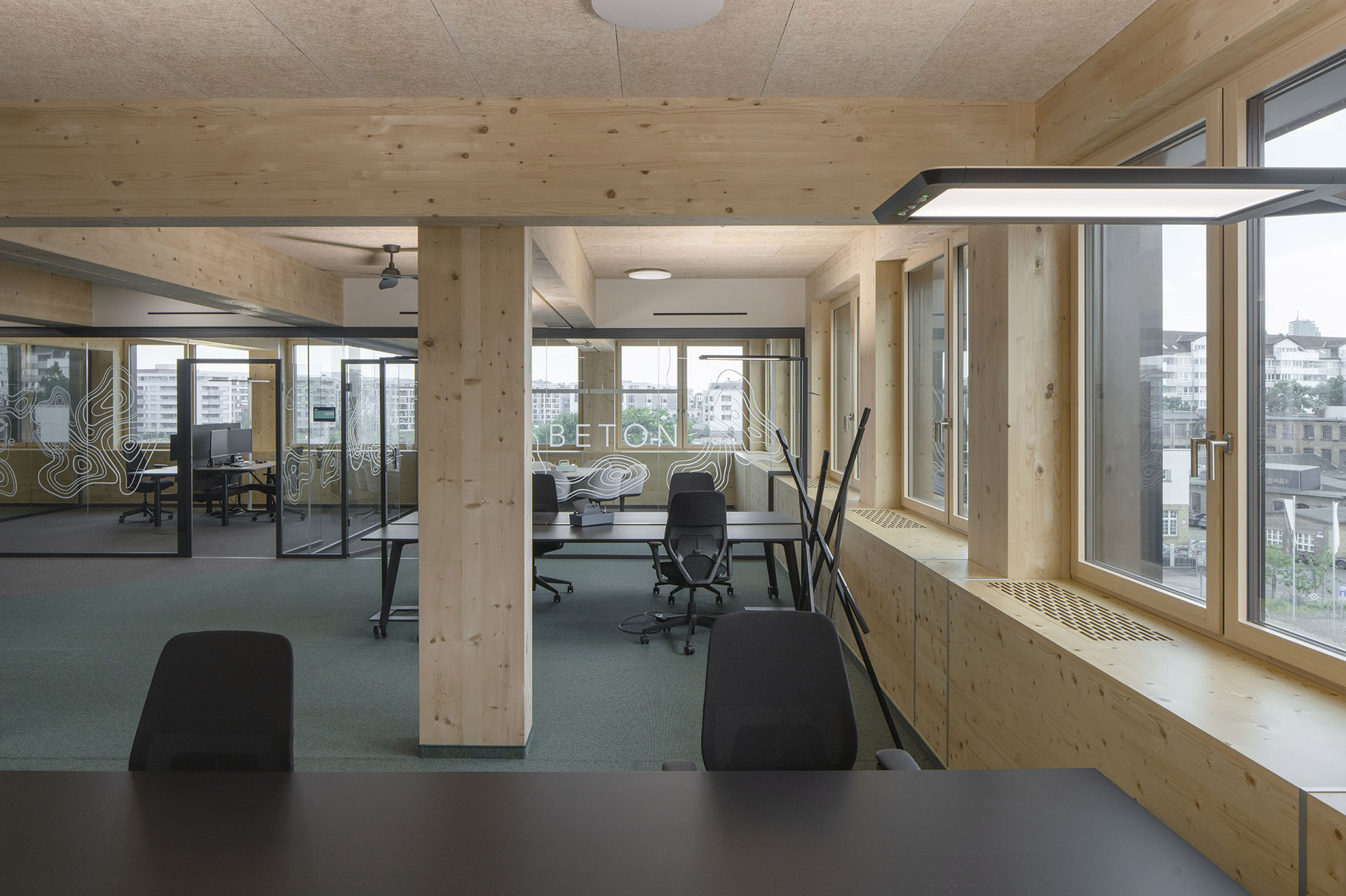 Für 'Wood', einem Gebäude mit hohem Wärmeschutz, wurde ein Lüftungskonzept ausgearbeitet, das mit Hilfe dezentraler Fassadenlüftungselemente, die in den Hohlboden bzw. in die Brüstung integriert sind, den modularen Konstruktionsansatz und die Flexibilität der Raumgestaltung unterstützt. Die dezentralen Lüftungsgeräte arbeiten mit wechselnder Strömungsrichtung und sorgen für ausgeglichene Lüftungsbilanz, indem sie jeweils paarweise mit Synchronsteuerung eingesetzt werden. Durch die integrierten Wärmetauscher bleibt der Energieverbrauch niedrig. Sie nutzen einen großen Anteil der Abluftwärme zur Zulufterwärmung.