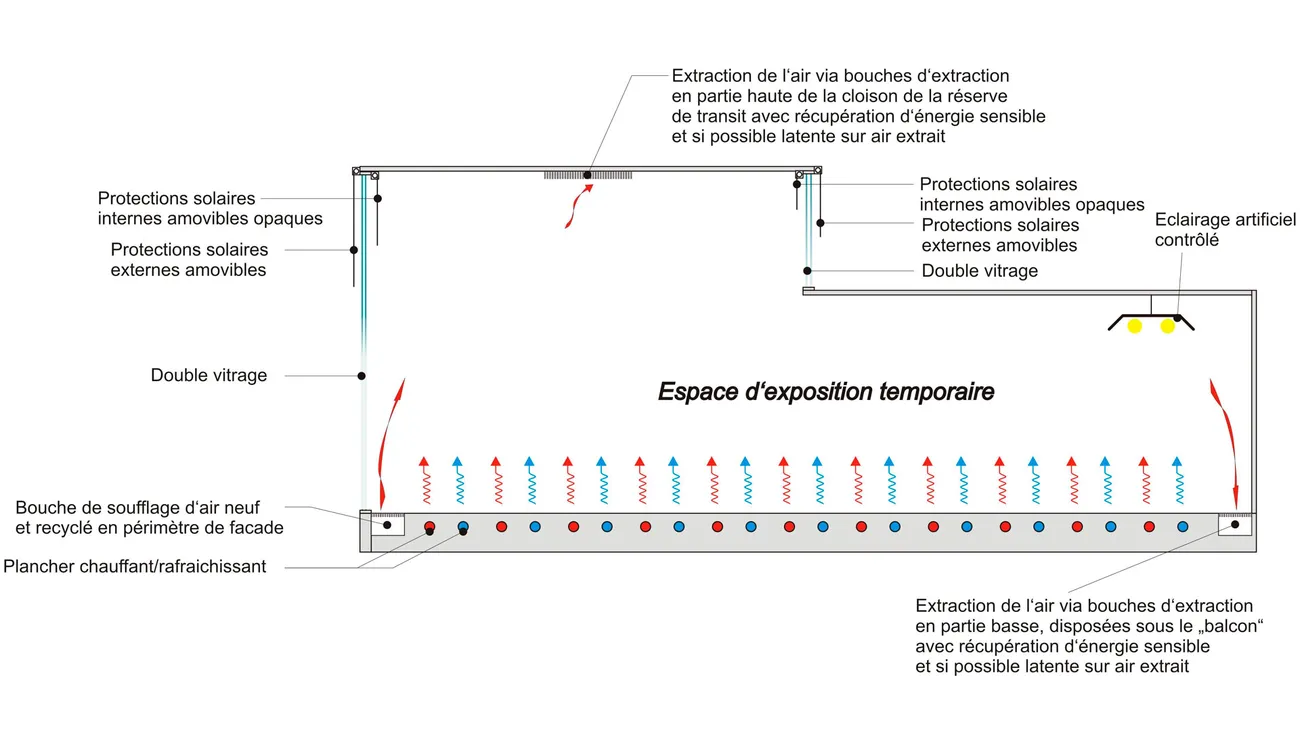 Das Hotel Gaillard ist ein denkmalgeschütztes Herrenhaus, das 1882 erbaut und 1921 von der Banque de France erworben wurde. Seither diente es bis zur Generalsanierung als riesiger Devisenspeicher der französischen Nationalbank. Nach dem aufwendigen Umbau zu einem öffentlichen Museum, der im Jahr 2018 abgeschlossen sein soll, ist die Gebäudenutzung nach wie vor den Themenschwerpunkten Wirtschaft und Währung gewidmet. Neben Büros und Besprechungsräume stehen ein Cafe sowie permanente Ausstellungsräume mit hohen internen Wärmelasten und engen Anforderungen an eine konstante Luftfeuchtigkeit zur Verfügung. Eine optimierte thermische Gebäudehülle war der erste Schritt für eine signifikante Reduzierung des allgemeinen Energieverbrauchs. Die Fenster wurden behutsam durch qualitativ hochwertige Komponenten ersetzt, die jedoch keinen Einfluss auf das äußere Erscheinungsbild des Gebäudes haben durften. Dies war eine strikte Vorgabe der Denkmalpflege. Angetrieben durch natürliche Auftriebskräfte im Treppenhausturm sorgt eine optimierte Nachtauskühlung für einen deutlich besseren sommerlichen Raumkomfort in den Büros. Das Café Monétaire und die temporäre Ausstellungsfläche werden über einen aktivierten Boden konditioniert und durch Quellluftauslässe belüftet. Die verbleibenden Bereiche sind ausschließlich mit Luftsystemen ausgestattet, die speziell für eine Integration in das Museumsmobiliar entwickelt wurden. Abhängig von ihrer Fassadenposition sind die Erker mit einem internen oder externen Sonnenschutz versehen. Das Konzept zur Energie-Versorgung basiert auf reversiblen Prozessen und erfüllt die hohen räumlichen Beschränkungen des Projekts. So kommen Klimageräte mit integrierten Kühlern zum Einsatz um die Zahl der Kühltürme auf dem Dach zu minimieren. Die Abwärme der Geräte wird für die Erzeugung von Warmwasser verwendet. Das Heizen des Gebäudes erfolgt über das Fernwärmenetz der Stadt Paris (CPCU). Der dabei entstehende Wärmeverlust bei der Wärmeübergabe wird ebenfalls für die Bereitung von Warmwasser genutzt. Transsolar beriet den Kunden weiter bei einem HQE Verfahren (ohne Zertifikat). Dazu gehörten unter anderem eine Konstruktion mit geringer Belastung für die Umwelt, ein vorbildlicher Umgang mit Wasser und die Wahl der Materialien für eine ausgezeichnete Qualität der Raumluft.