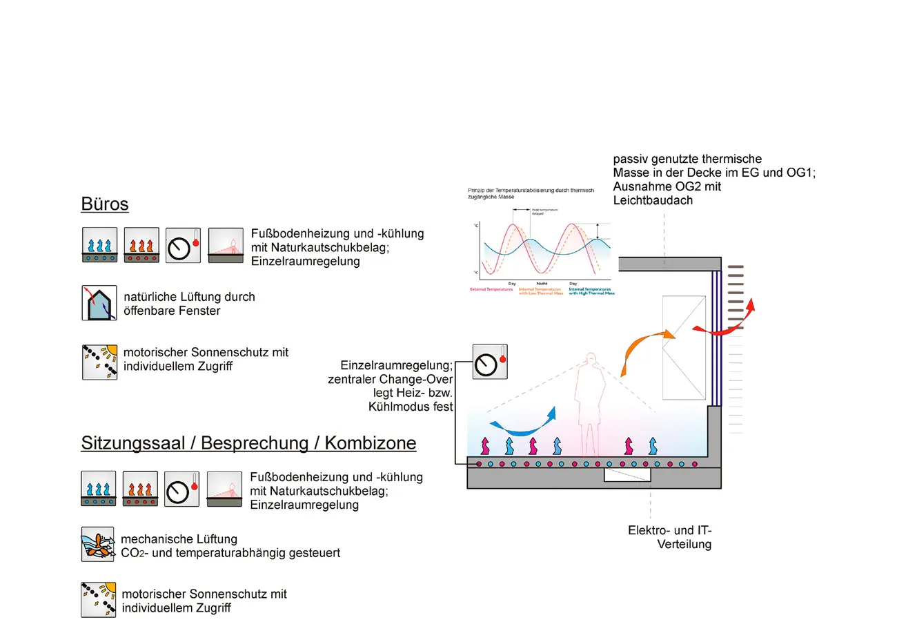 Durch die Lage in einer verkehrsberuhigten Zone mit schallminderndem Baumbestand können die Büroflächen rein natürlich über die Fenster belüftet werden. In den zur Seestraße orientierten Büros kommen jedoch besondere Fensterbeschläge zum Einsatz, die eine Spaltlüftung mit erhöhtem Schalldämmmaß ermöglichen. Sitzungssaal, Besprechungsräume sowie die Kombizonen sind bedingt durch die zu erwartenden Personendichten mit einer zentralen, mechanischen Be- und Entlüftung ausgestattet. Das Heizen und Kühlen erfolgt mittels eines thermisch aktivierten Fussbodens, der mit Hilfe einer Einzelraumregelung betrieben wird. Dem sommerlichen Wärmeschutz ist durch einen außenliegenden, motorisierten Sonnenschutz genüge getan.